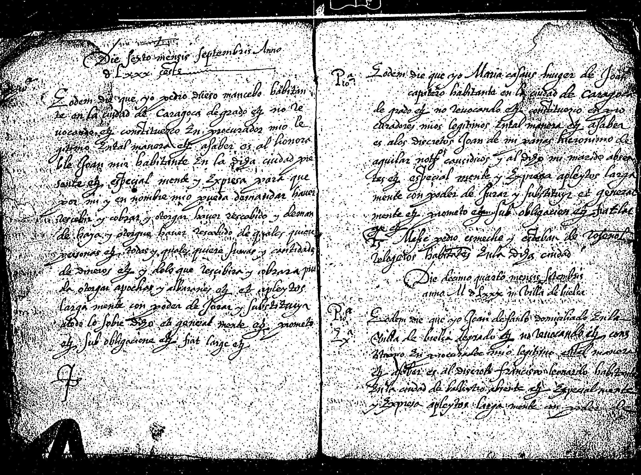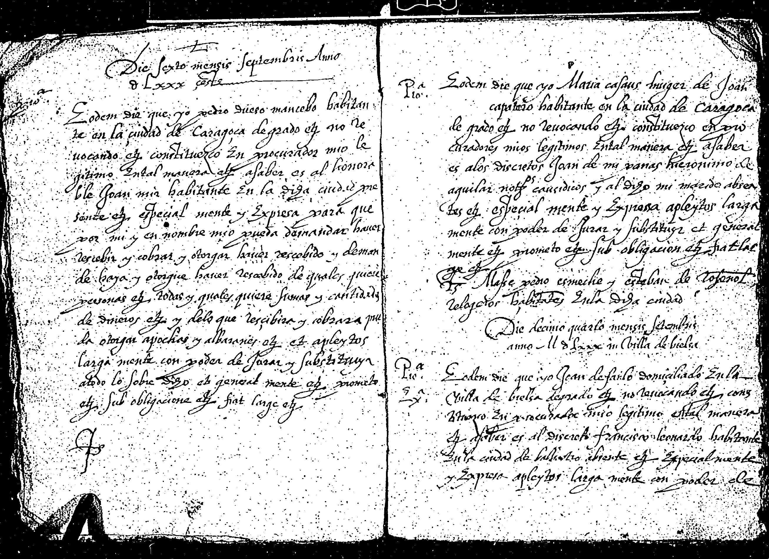 | Contenido: Pedro Dueso mancebo habitante en la ciudad de Zaragoza nombra procurador suyo al honorable Juan Mur habitante en la ciudad de Zaragoza especialmente para recibir y cobrar. |