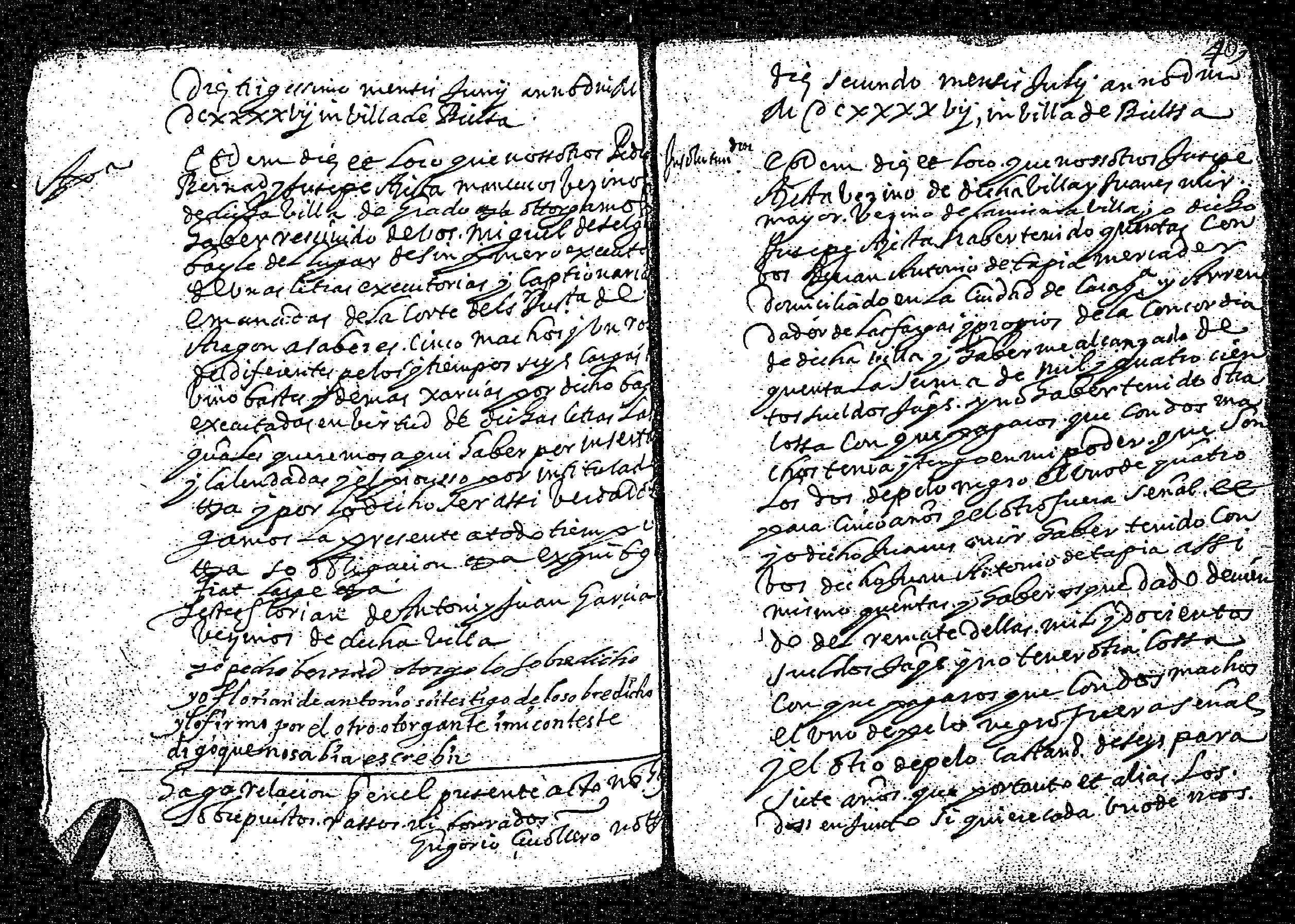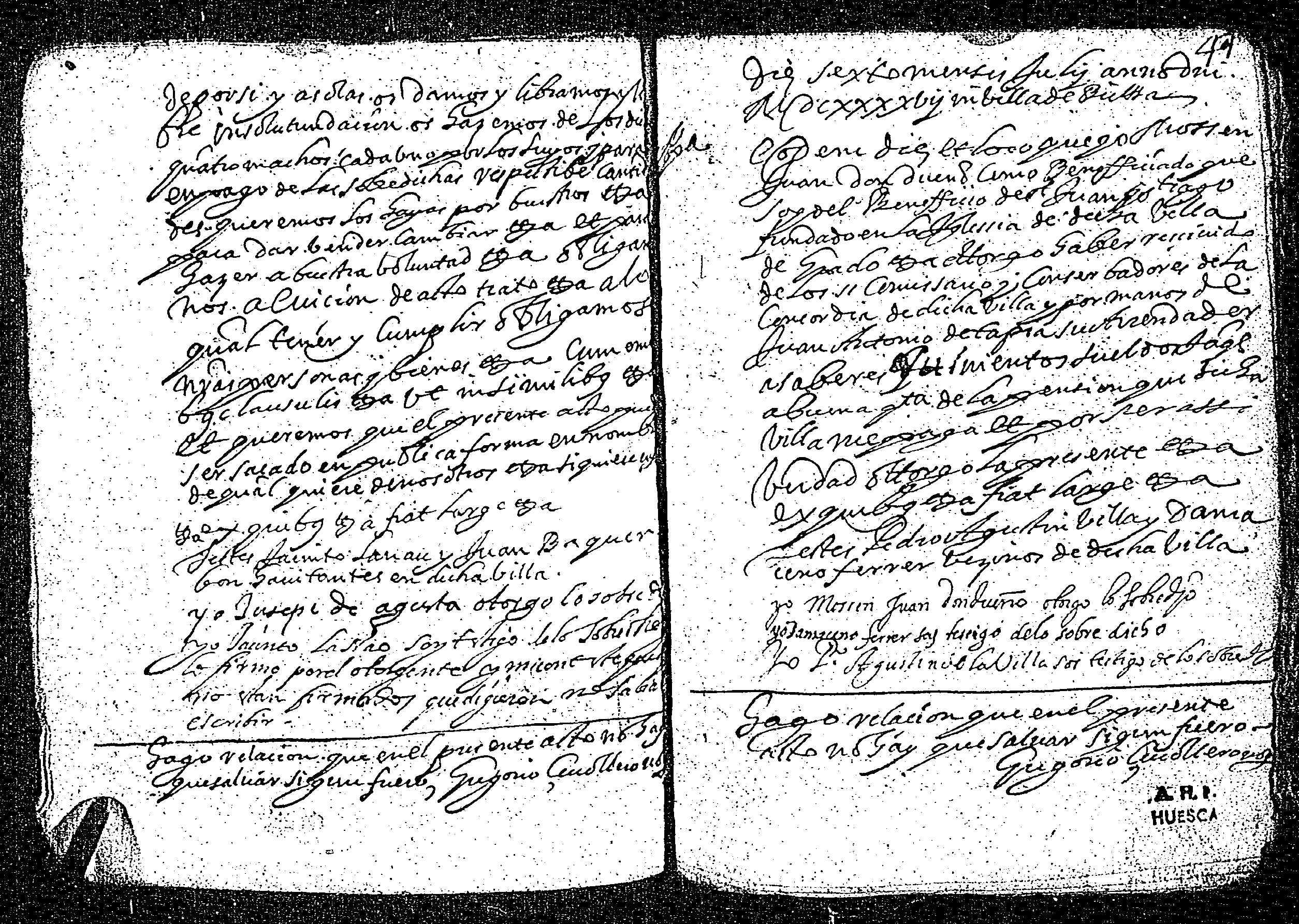 | Contenido: Dado que Jusepe Arista vecino de la villa de Bielsa ha tenido cuenta con Juan Antonio de Tapia, mercader, domiciliado en la ciudad de Çaragoça y arrendador de las fargas y propios de la concordia de dicha villa y haberle alcanzado la suma 1400 s. jaq. y no haber otra cosa con que pagarla mas que con dos machos que tenía y ahora tiene Juan de Mir; y dado que este ha tenido cuenta con dicho Juan Antonio de Tapia y haberle alcanzado la suma 1200 s. jaq. y no haber otra cosa con que pagarla mas que con dos machos y los dos que le ha dado Jusepe Arista; así le entregan dichos cuatro machos en pago de dichas ambas deudas. |