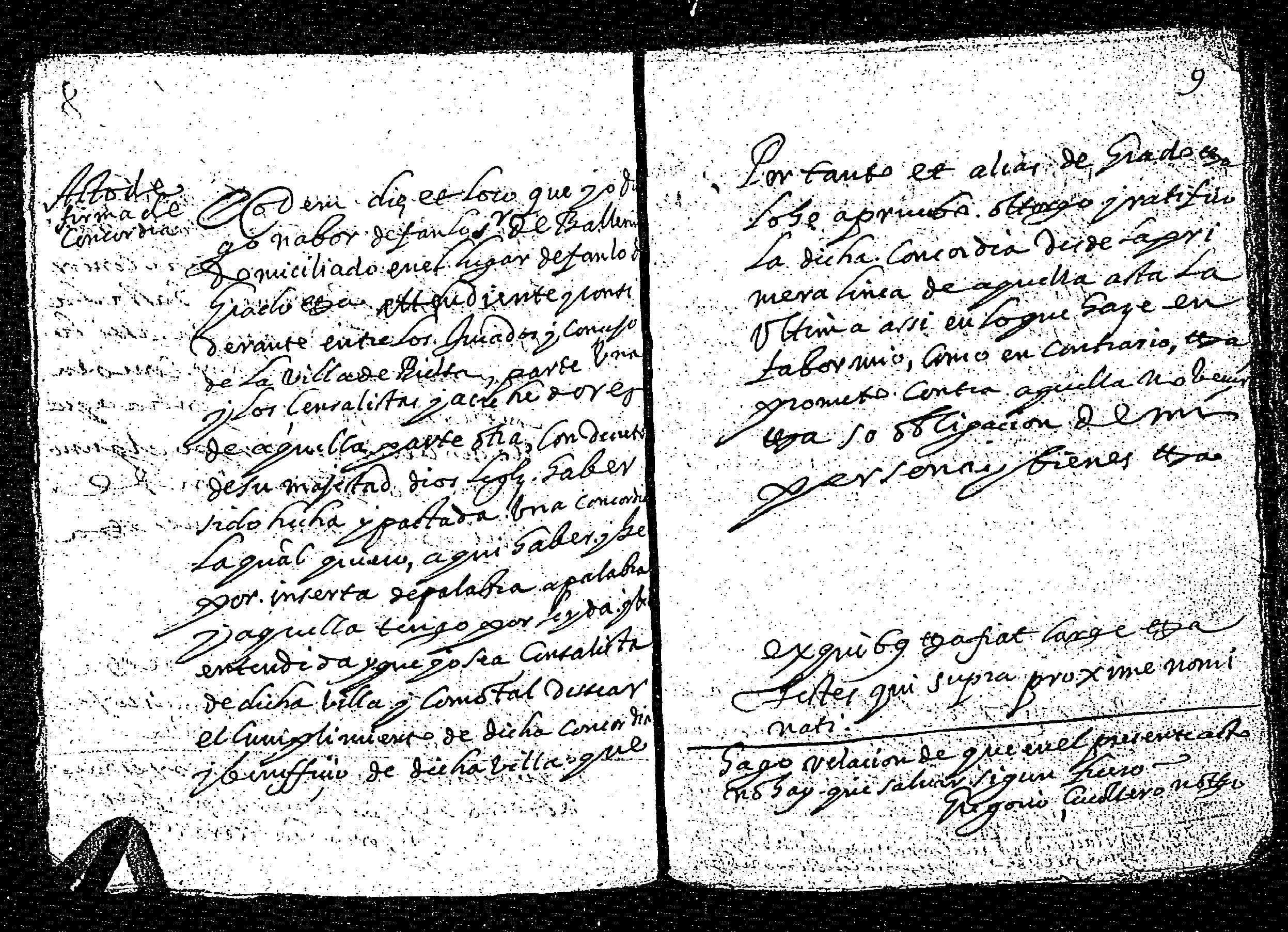 | Contenido: Diego Nabor de Fanlo, señor de Ballarin y domiciliado en Fanlo, en su nombre, atendiente que los jurados de la villa de Bielsa y sus censalistas de una parte y los acreedores de esta villa de la otra han pactado concordia, de grado la firma y loa en su nombre. |