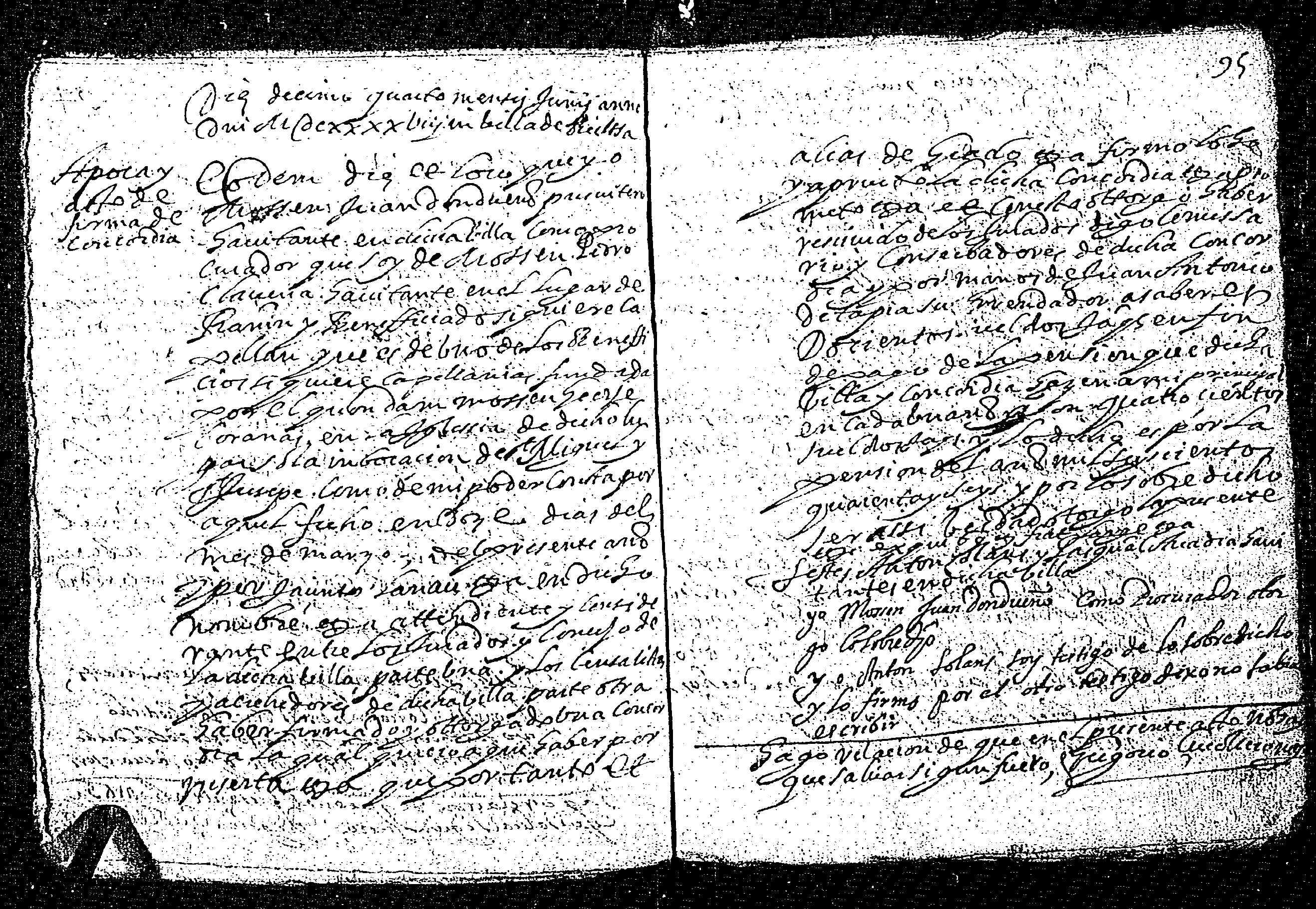 | Contenido: Mss. Juan Dondueño, Parmisen, habitante en la villa de Bielsa, como procurador de Pedro Clavería, habitante en el lugar de Rañin, capellán de la capellanía fundada por el qd. Jayme Coronas en la iglesia de Rañin, reconoce haber recibido de manos de Juan Antonio de Tapia, arrendador de la concordia de la villa, la suma de 200 s. jaq. por fin de pago de su pensión de 400 s. del año 1646 y firma la concordia de la villa de Bielsa. |