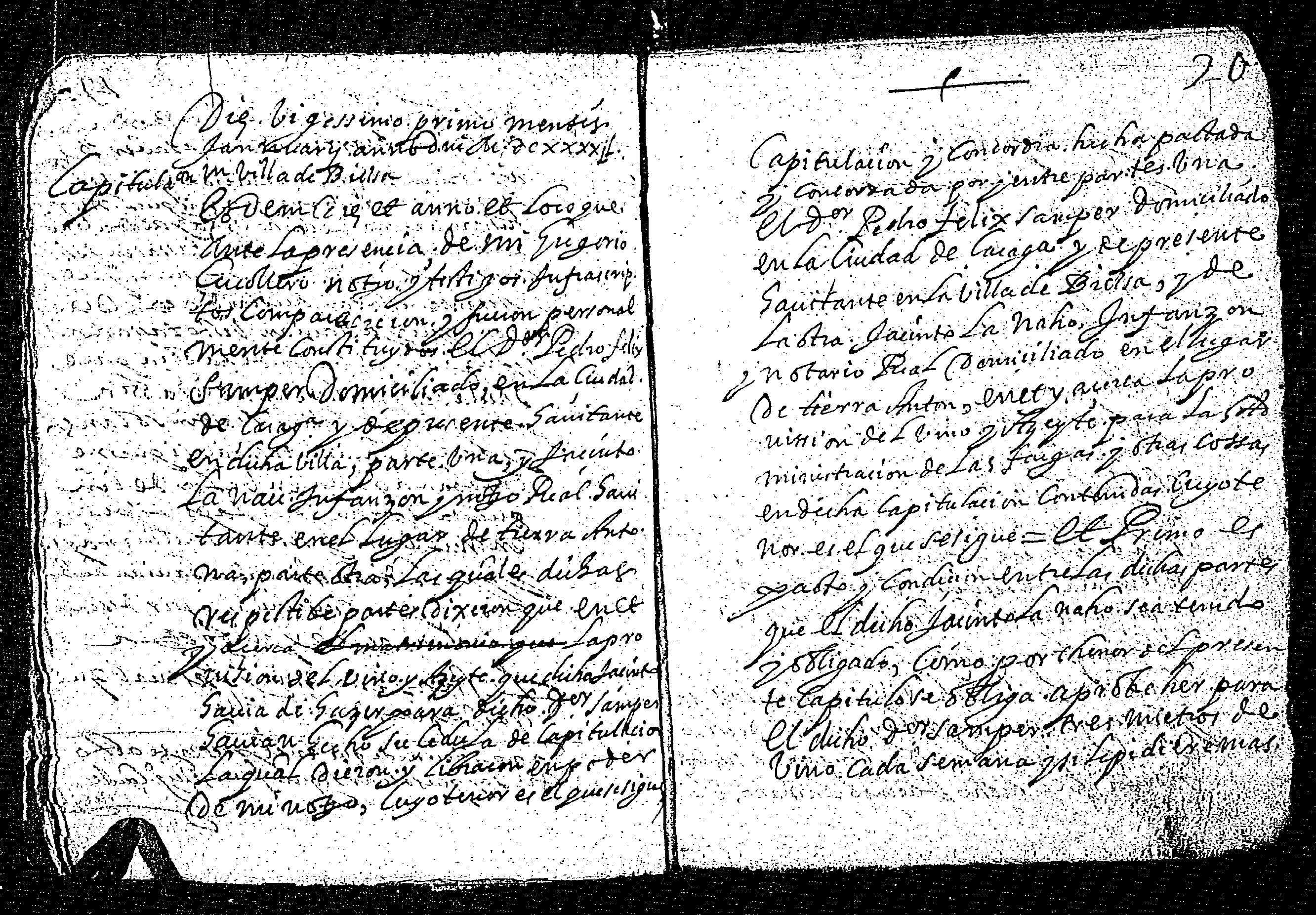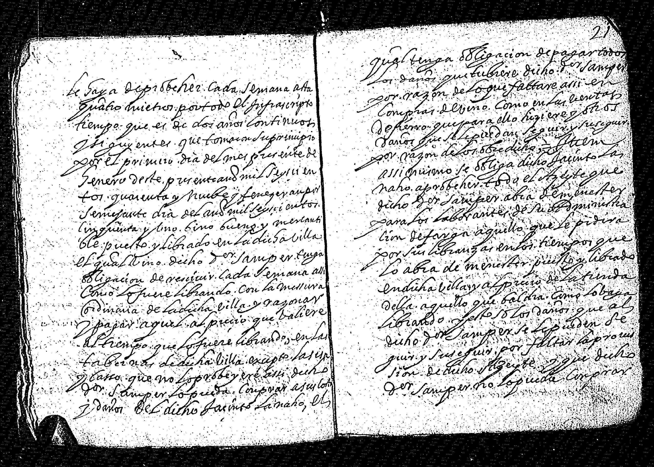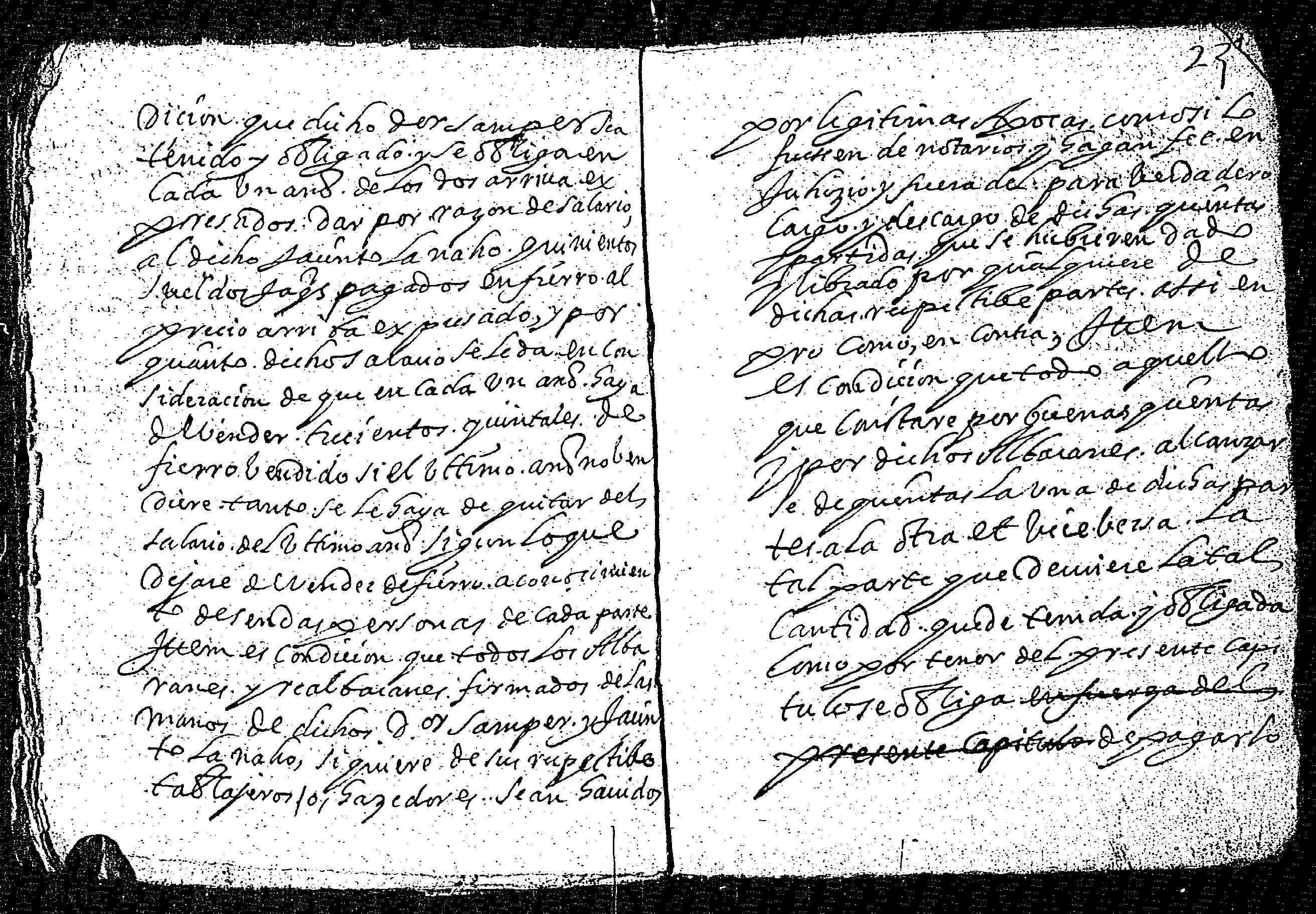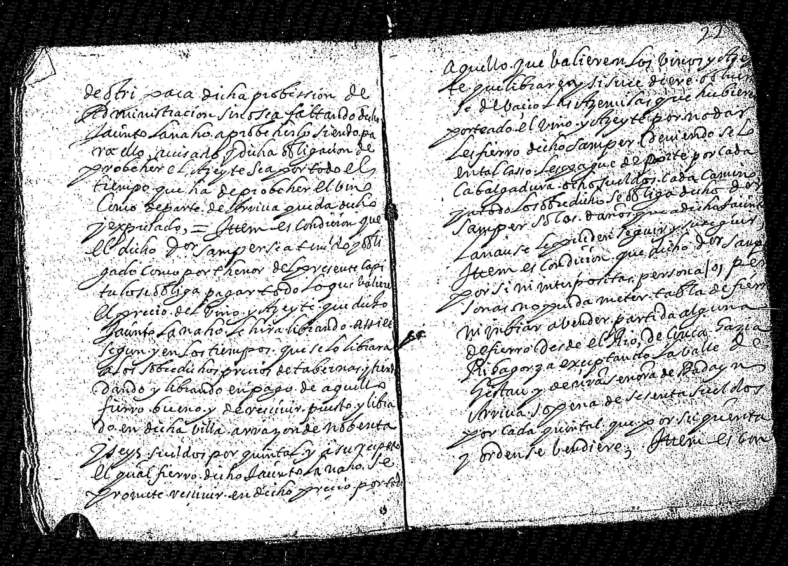 | Contenido: Comparecen de una parte el Doctor Pedro Felix Samper, domiciliado en la ciudad de Zaragoza y de presente habitante en Bielsa y de la otra Jacinto La Naho, infanzón, notario, domiciliado en Tierrantona, para la capitulación de la provisión de vino y aceyte de las fargasde la villa y otras cosas; Que se obliga a dicho Jacinto La Naho a proveher a dichas fargas tres nieltros de vino a la semana y si le pidiese mas hasta cuatro nieltros, y esto por tiempo de dos años continuos desde el presemte día de 1649 a idem de 1651, en la medida de la presente villa y al precio nque valiere en su momento en las tabernas de la villa, debiendo pagarse todos los daños consecuencia de su falta; Item todo el aceite que se precisase para los laborantes de la farga en ese tiempo, al precio de las tiendas de la villa, debiendo pagarse todos los daños consecuencia de su falta; Item se pagará todo lo abastecido en fierro puesto y librado en la villa a 96 s. el quintal, y si las acemillas que hubiesen porteado el vino o aceyte se fueran de vacío se pague por cabalgadura 8 s. jaq; Item el dicho La Naho no podrá vender dicho fierro ni en la tabla de la villa ni enviar ni vender partida desde el río Cinca a la Ribagorza, excepto la valle de Gistau, y de la valle de Badayn arriba so pena de 60 s. jaq. por cada quintal; Item cada año se pagará a La Naho por su salario 500 s. jaq. en fieroal precio expresado de los que podrá vender en la villa 300 s. en fiero; Item que todos los albaranes librados lo sean por legítimas ápocas |