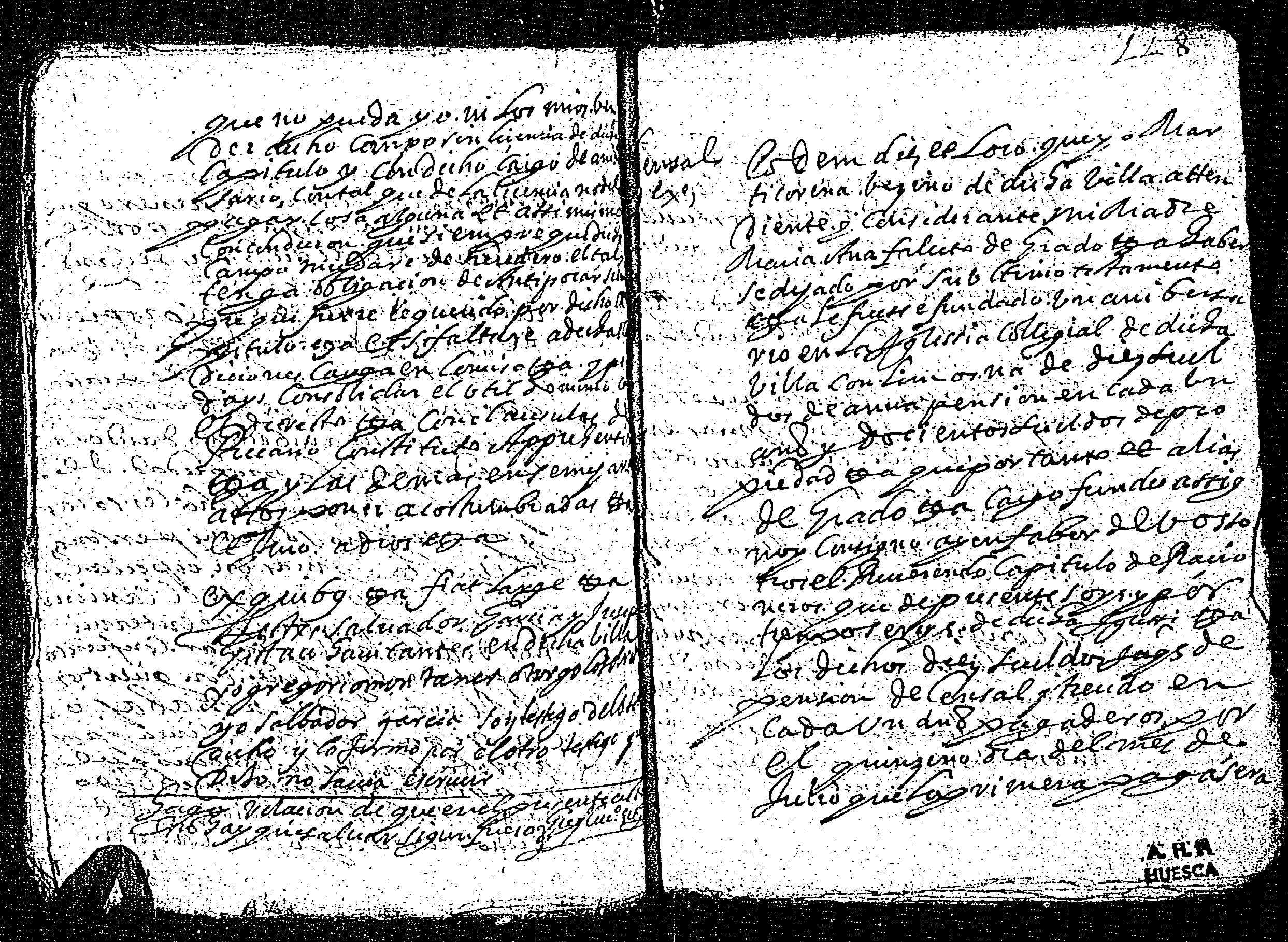 | Contenido: Marti Corena, vecino de Bielsa, atendiente María Falceto, su madre, en su último testamento haber dejado un aniversario fundado en dicha colegial de 10 s. jaq. de anual pensión y 200 s. jaq. de propiedad, acepta tal censo a favor del capítulo de racioneros de dicha colegial pagadero anualmente para el 15 de julio desde 1650, obligando especialmente un campo suyo sito en la villa, con la condición de que si lo venden no paguen derecho alguno por ello, si bien se conserve la carga del censo sobre dicho campo. |