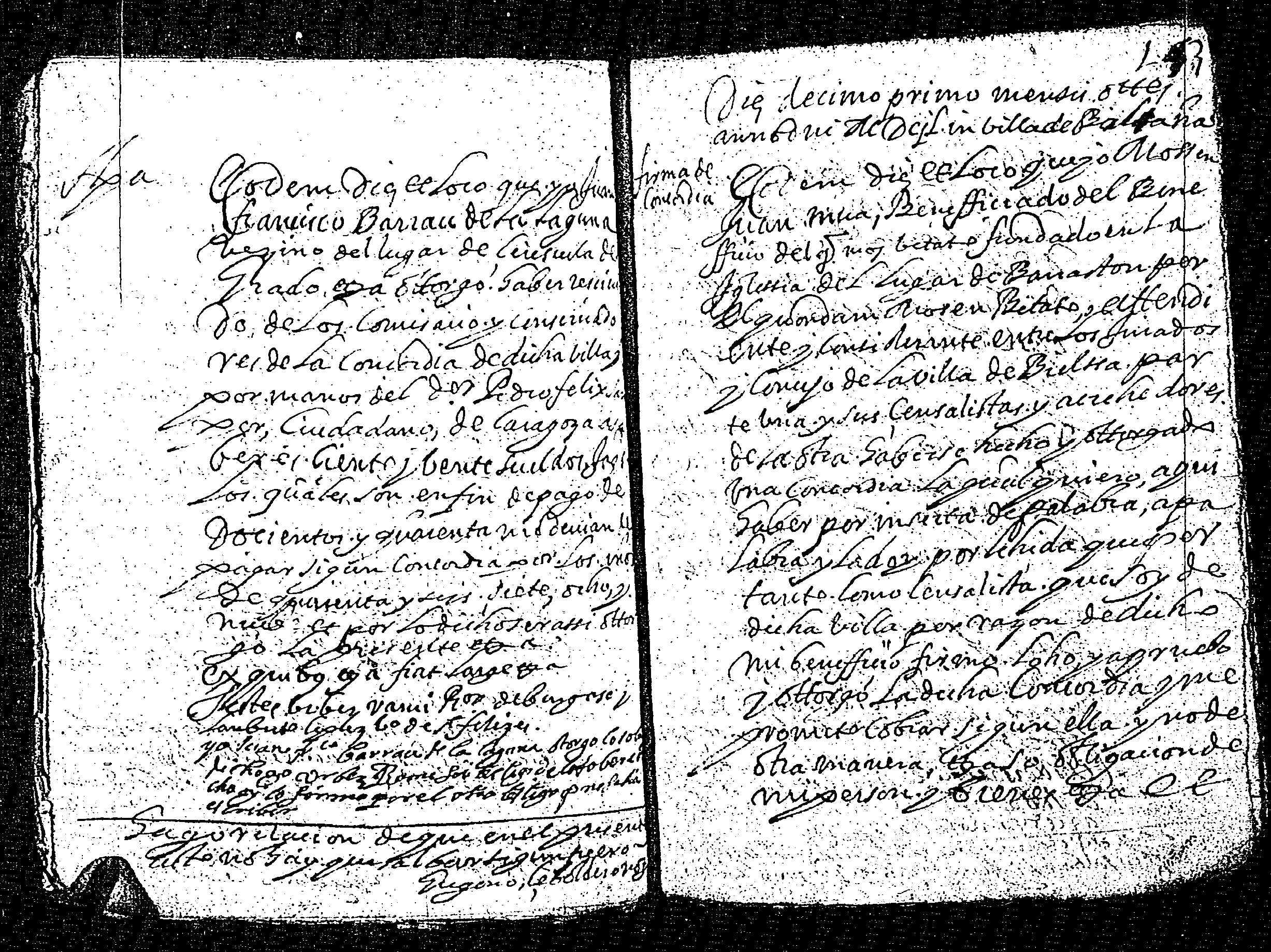 | Contenido: Juan Francisco Barrau de la Laguna, vecino de Ceresuela, otorga haber recibido de los conservadores de la concordia de Bielsa por manos de Pedro Felix Samper 120 s. jaq. en fin de pago de la suma de 240 s. jaq. de sus pensiones de 1646, 1647, 1648 y 1649. |