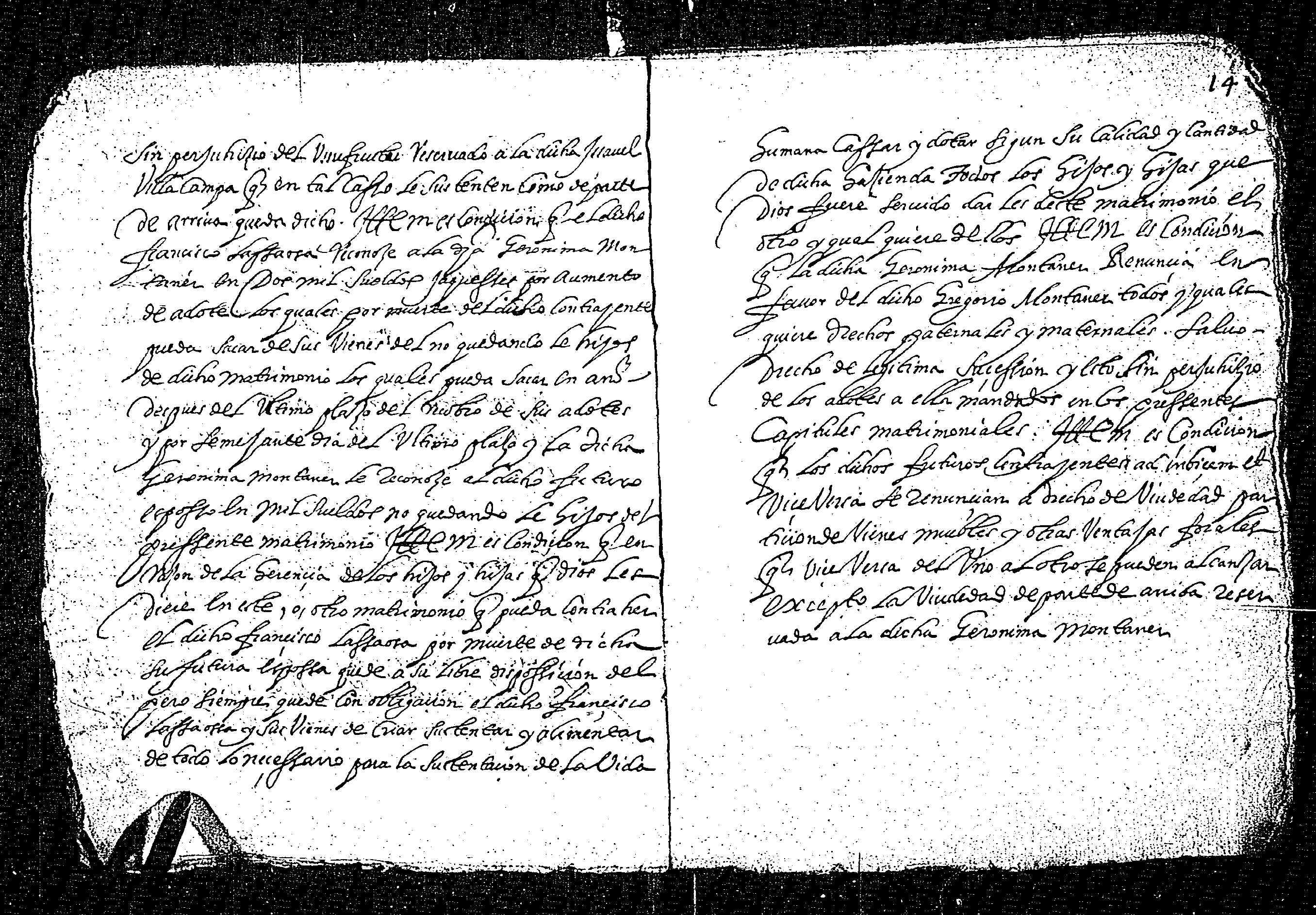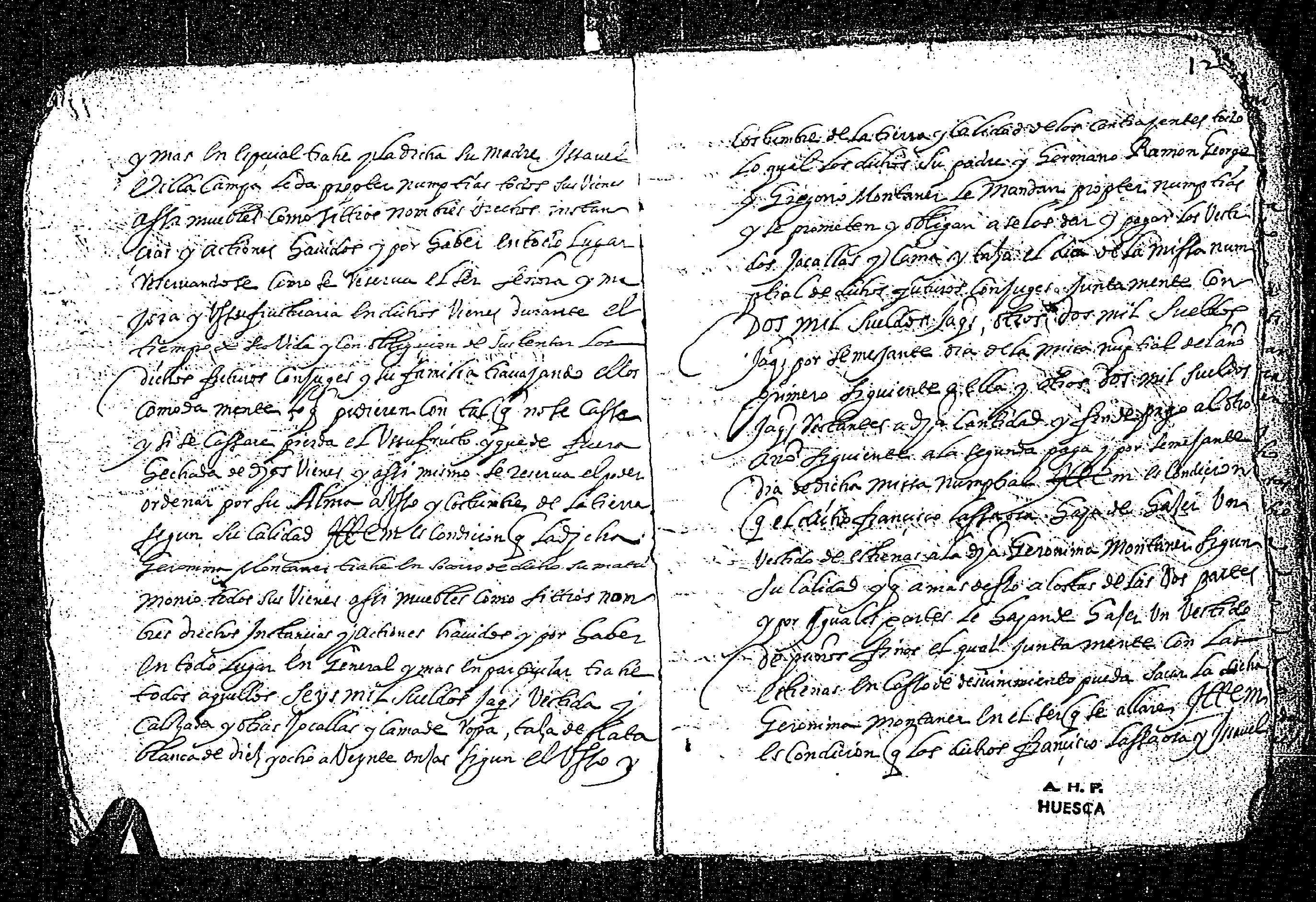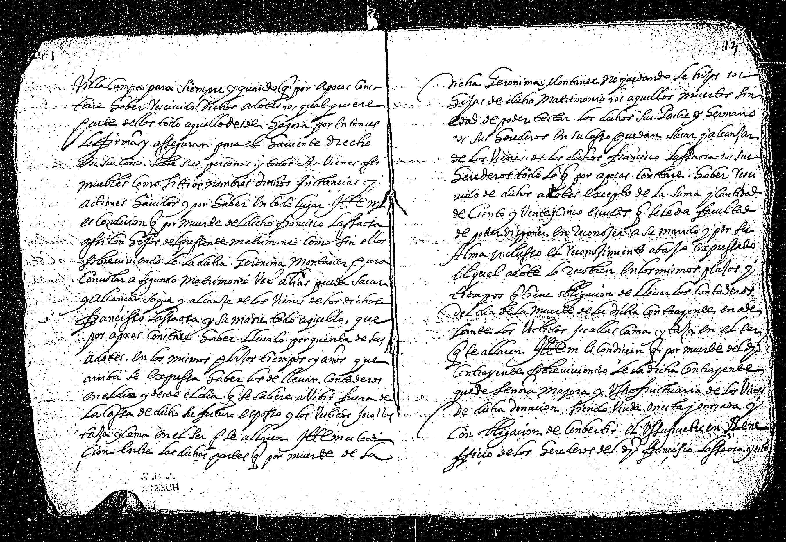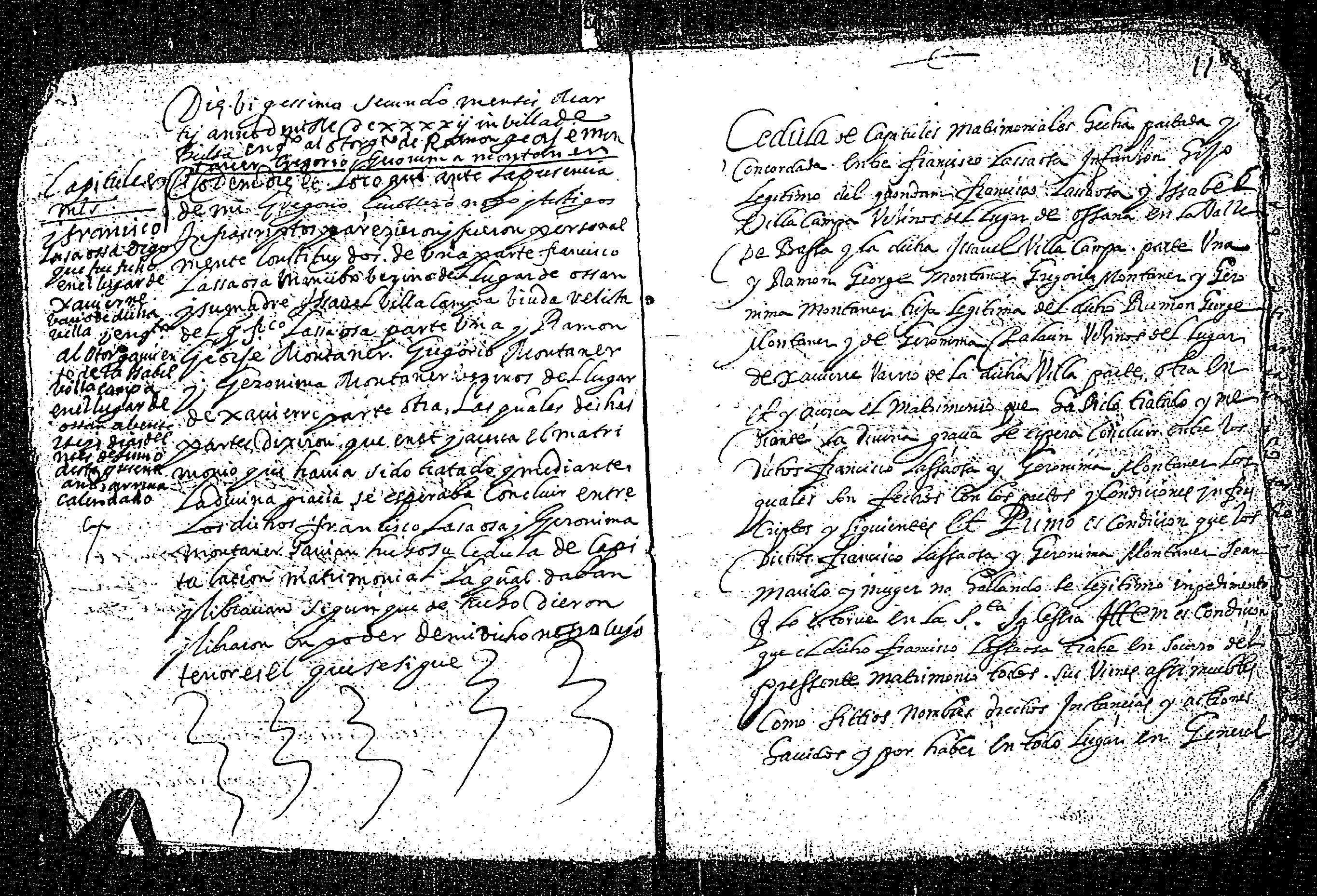 | Contenido: Comparecen de una parte Francisco Lassaosa, mancebo, vecino del lugar de Ossau y su madre Issabel Villa Campa viuda de Francisco Lassaosa; de la otra Ramon George Montaner, Gregorio Montaner y Gerónima Montaner, vecinos de Xavierre; para capitular matrimonio entre Francisco Lassaosa, infanzón, y Gerónima Montaner. |