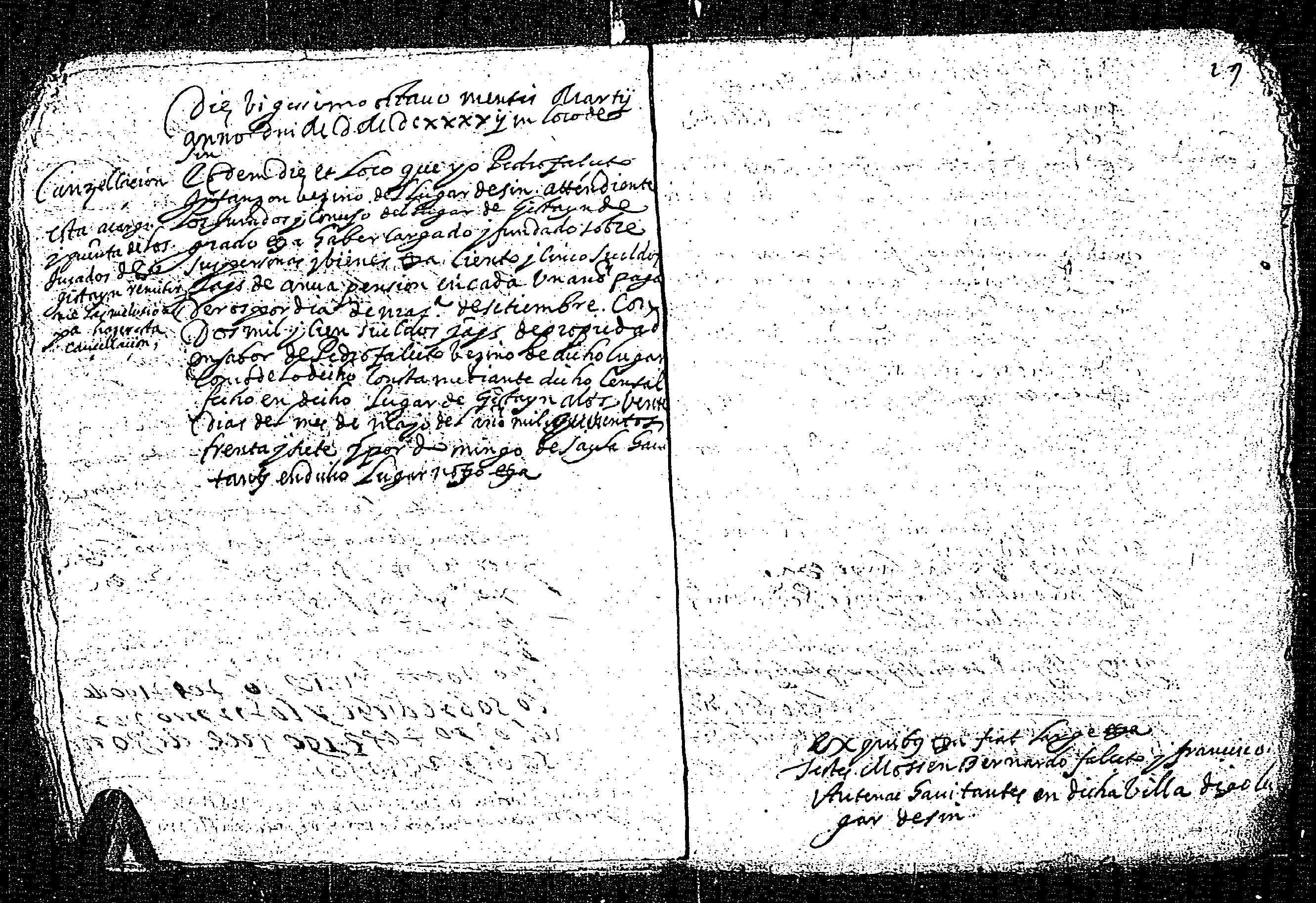 | Contenido: [incompleta].Pedro Falceto, infanzón, vecino del lugar de Sin, atendiente que los jurados del lugar de Gistayn cargaron sobre sus bienes un censal de 105 s. Jaq. de anual pensión pagaderos para San Miguel de septiembre, con 2100 s. Jaq. de propiedad a favor de Pedro Falceto el año 1537 [incompleto]. |