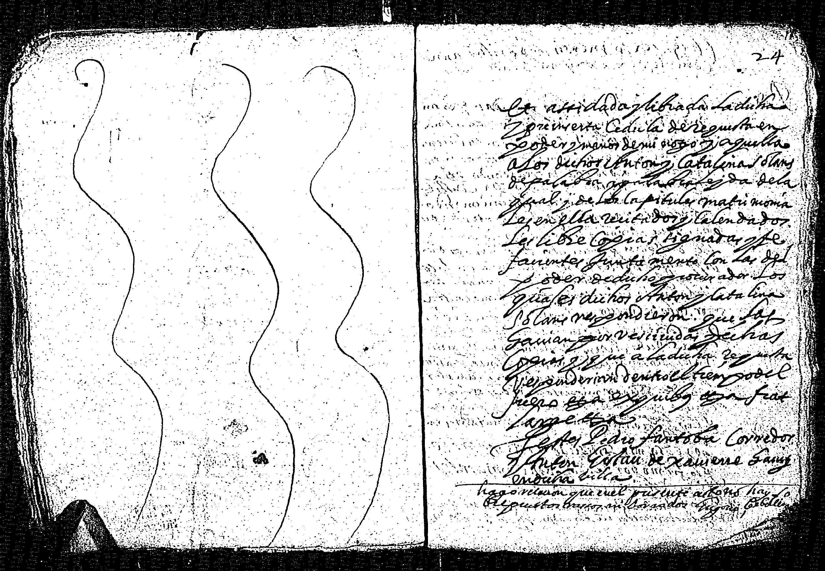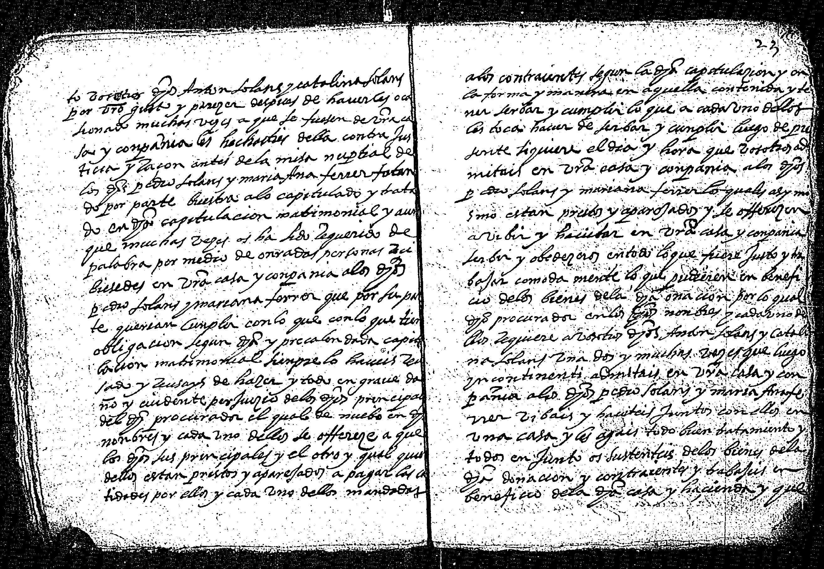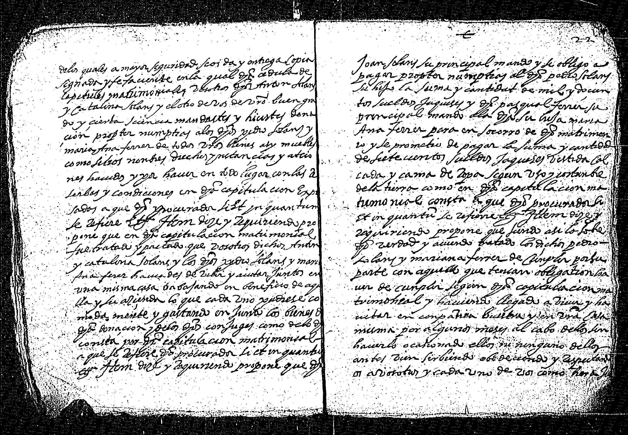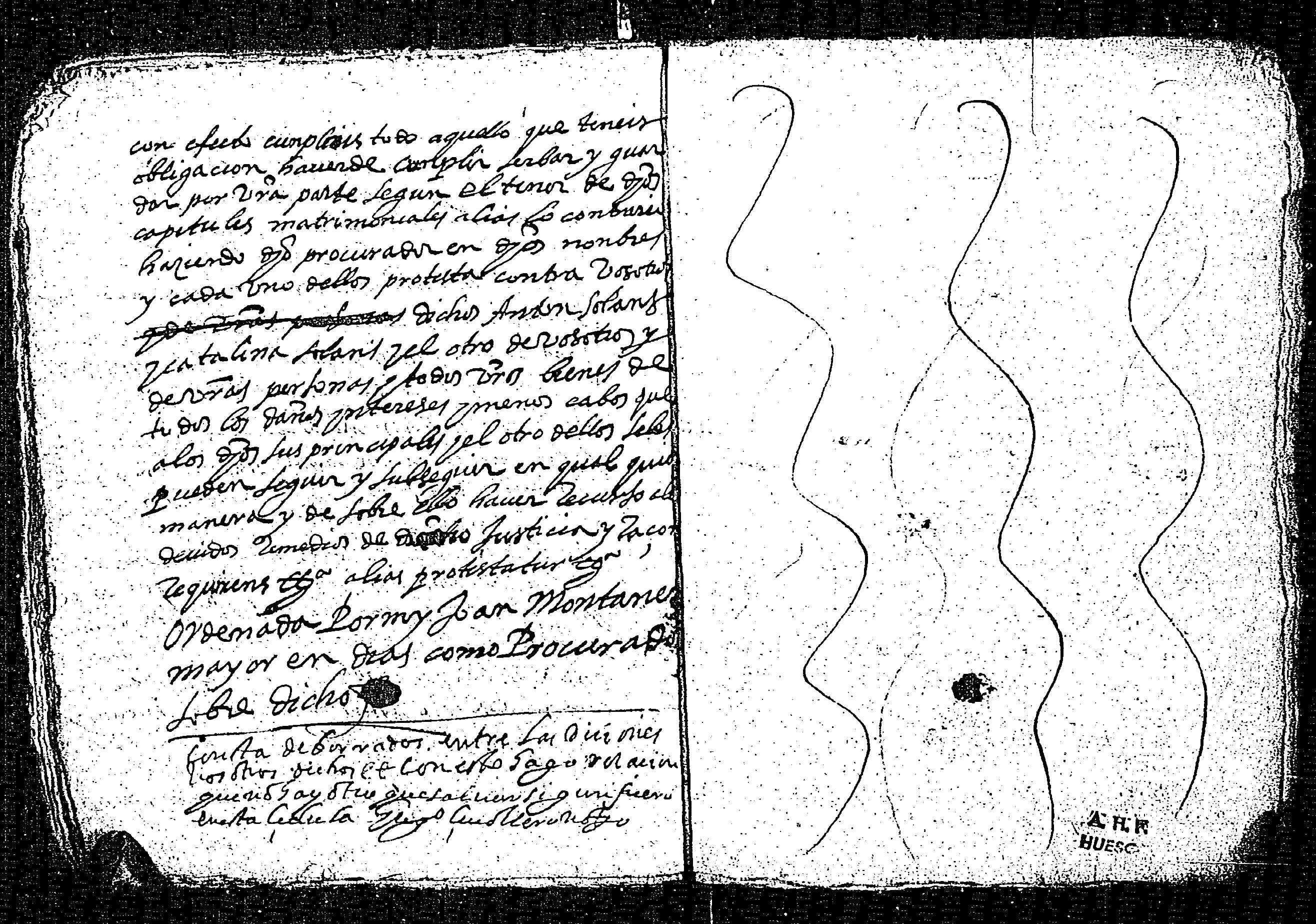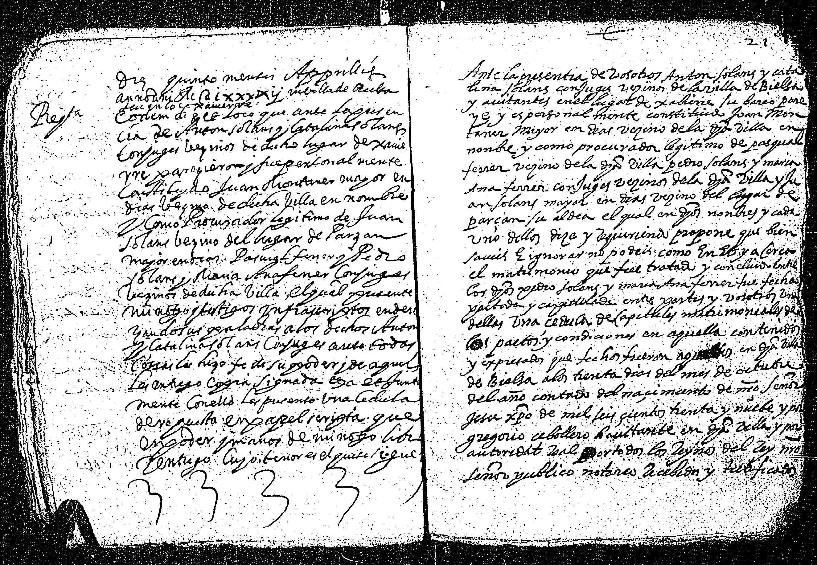 | Contenido: Ante Juan Montaner mayor en días, vecino de la villa de Bielsa, como procurador de Juan Solans mayor en días, vecino de Parzán, Pascual Ferrer, Pedro Solans y Maria Ana Ferrer, conyuges, vecinos de dicha villa; Comparecen Antón y Catalina Solans y el dicho Juan Montaner les hace entrega de un papel por el que reclama para sus principales ciertos derechos y cantidades debidos por capitulación matrimonial hecha entre dichos Antón y Catalina Solans a 30 e octubre de 1639 ante este notario. |
