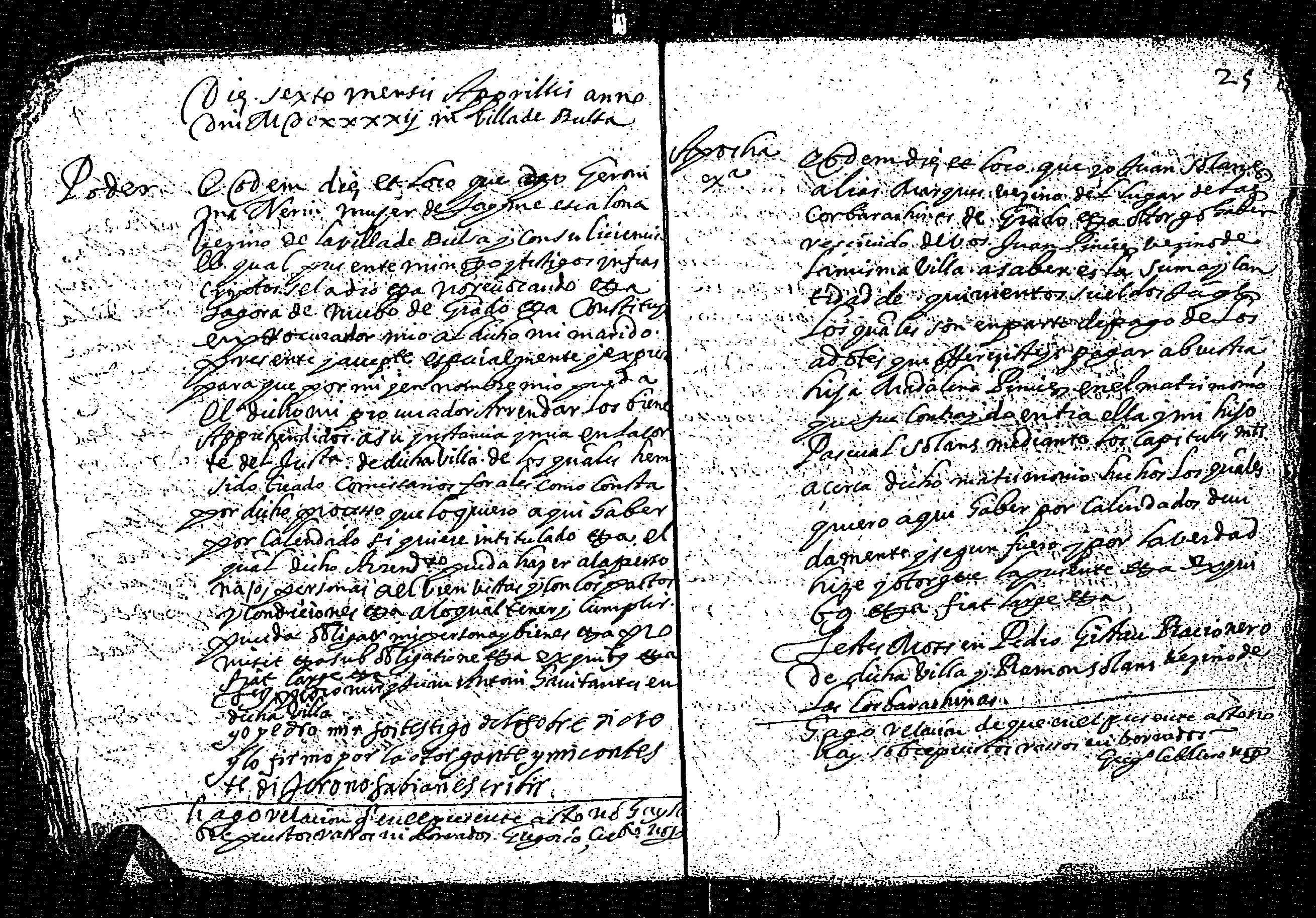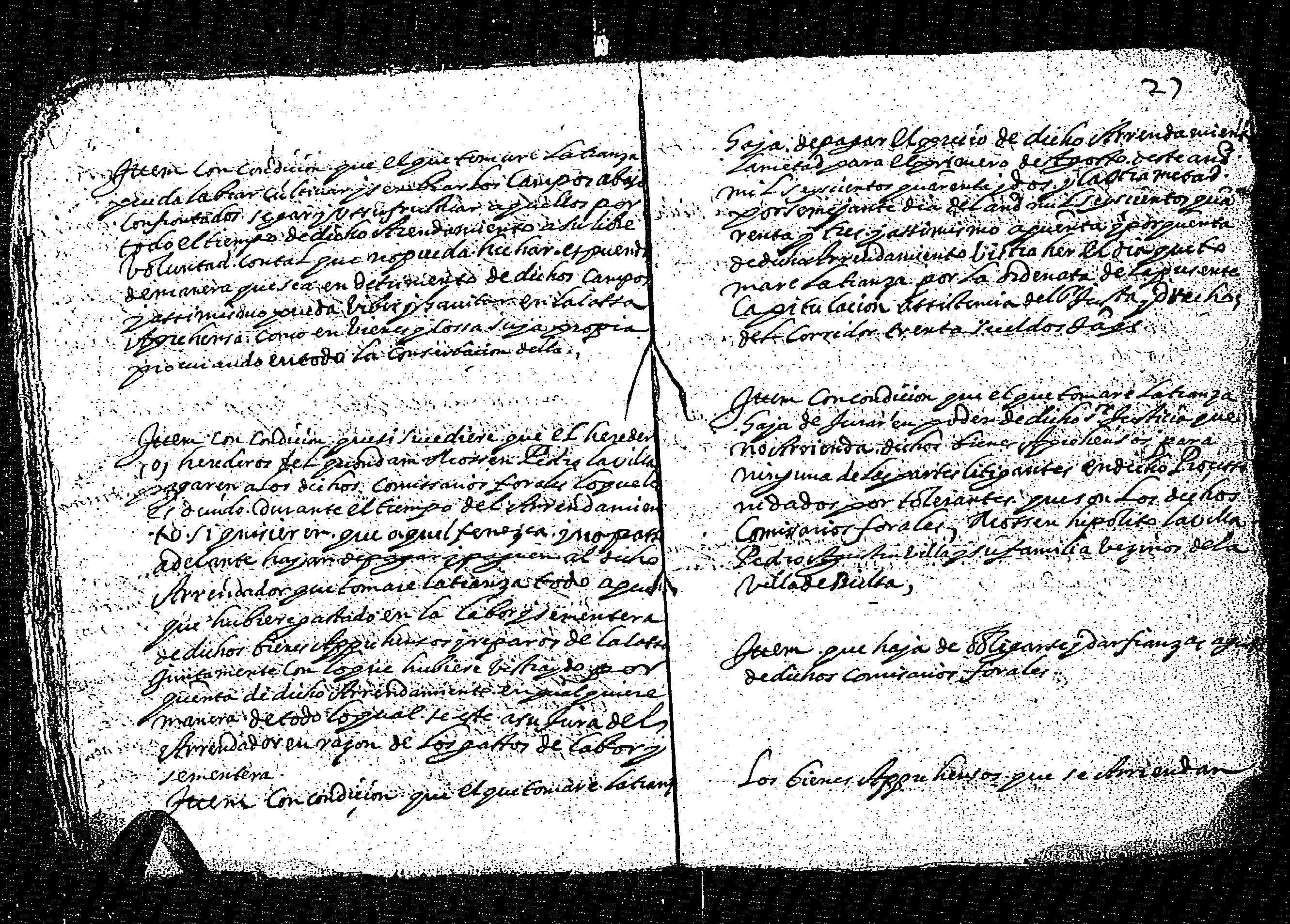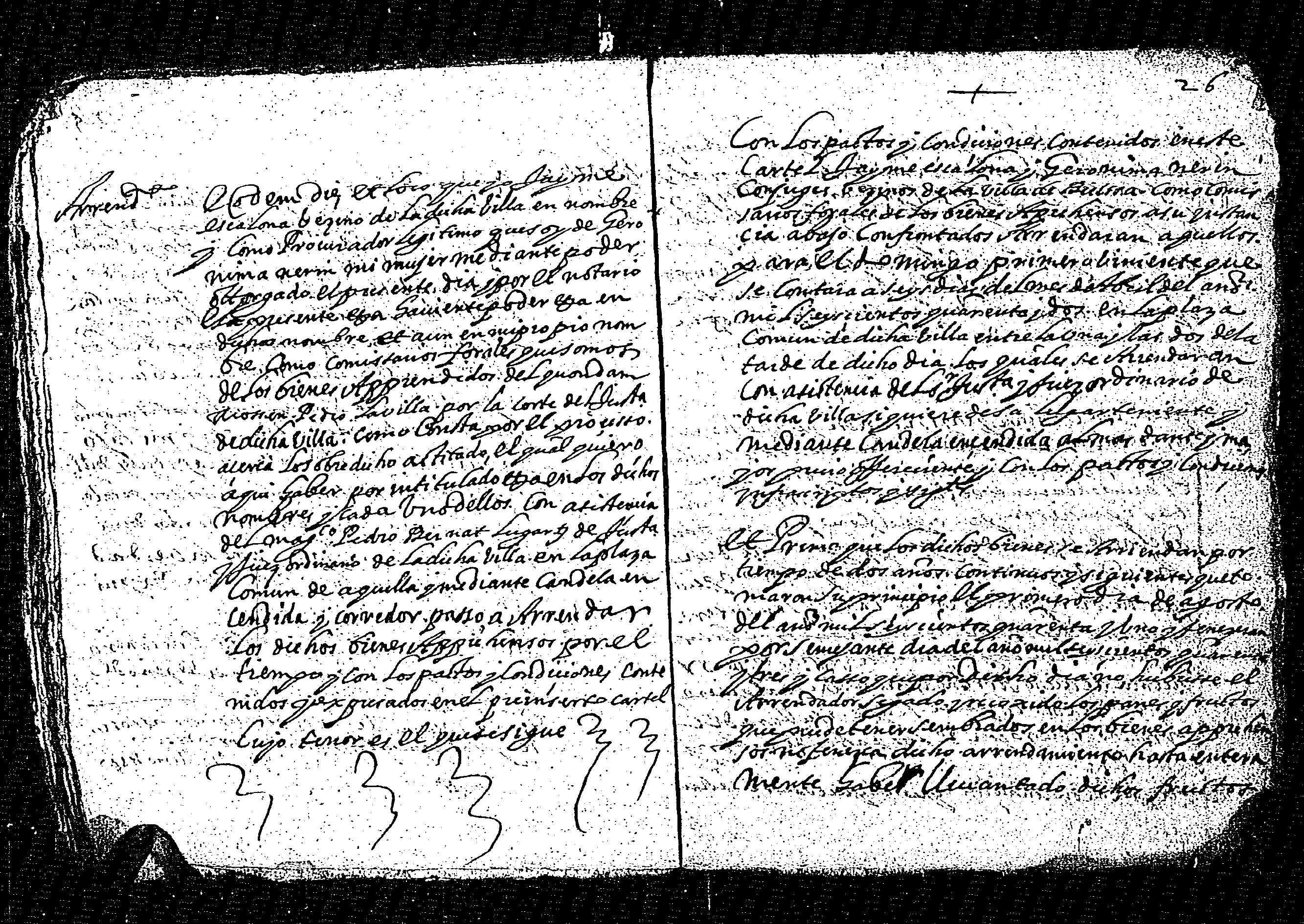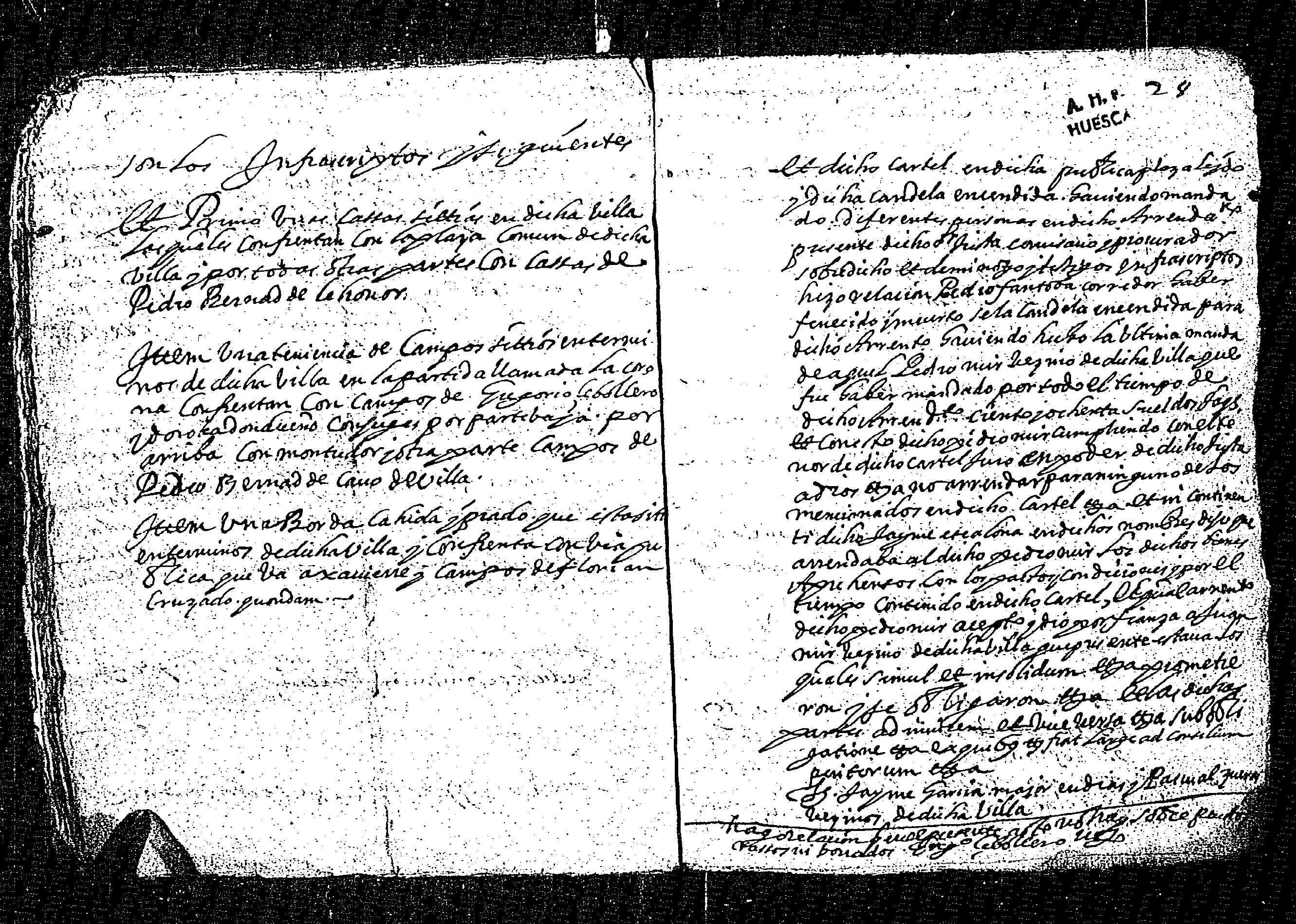 | Contenido: Jayme Escalona, vecino de la villa de Bielsa, como procurador de Geronima Nerin, su esposa, en los bienes aprehensos precalendados [entrada 21] que fueron del quondam mss. Pedro Lavilla, arrienda a candela pública y en la plaza de dicha villa esos bienes ante la presencia de Pedro Bernad, lugarteniente de justicia y juez ordinario de la misma; consisten dichos bienes en unas casas, campos, borda caída y prado en dicha villa; se arriendan por dos años continuos, a favor de Pedro Mir, por precio de 180 s. Jaq. |