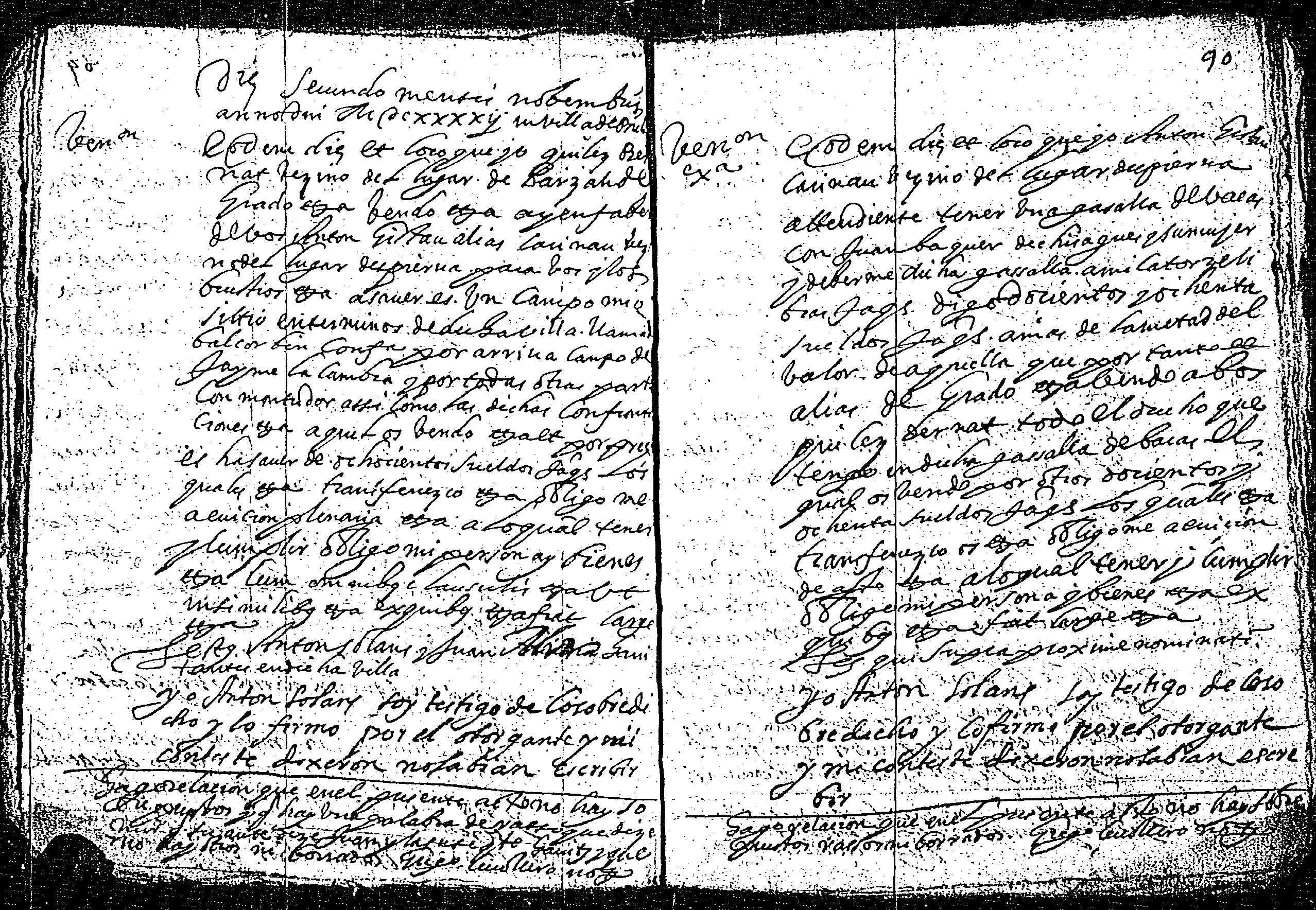| Contenido: Antón Gistau, alias Carinau, vecino del lugar de Espierba, atendiente a tener una gasalla de vacas con Juan e Baguer de Chisagues y deberle de dicha gasalla 280 s. Jaq. por la mitad de valor de aquella, vende a favor de Quilez Bernat, vecino del lugar de Parzan, todo su derecho en esa gasalla por precio de dichos 280 s. jaq. |