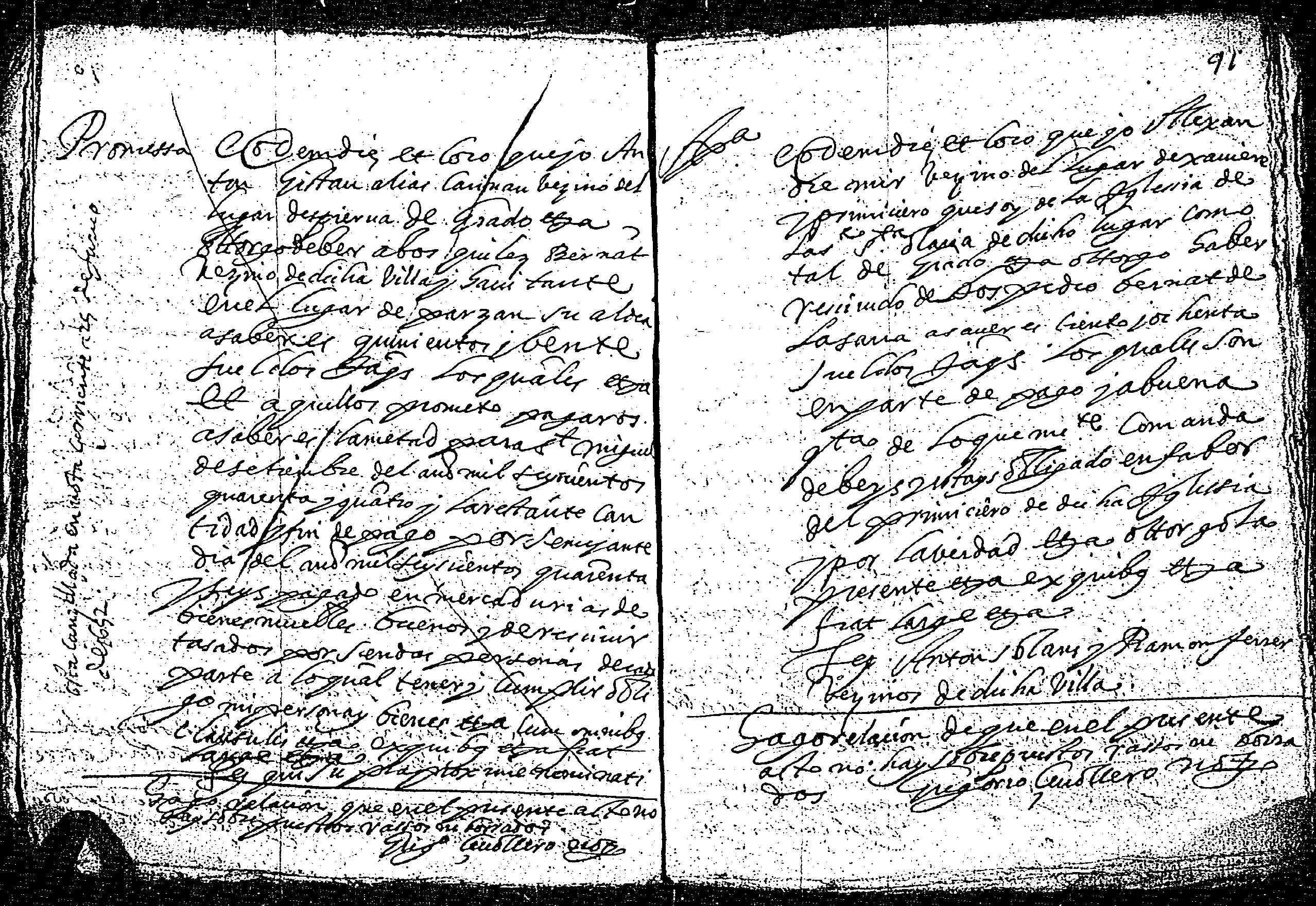 | Contenido: Alexandre Mir, vecino del lugar de Xavierre como primiciero de la iglesia de Santa Olaria de dicho lugar, otorga haber recibido de Pedro Bernat de Lasarra la suma de 180 s. jaq. en parte de pago de una comanda mayor. |