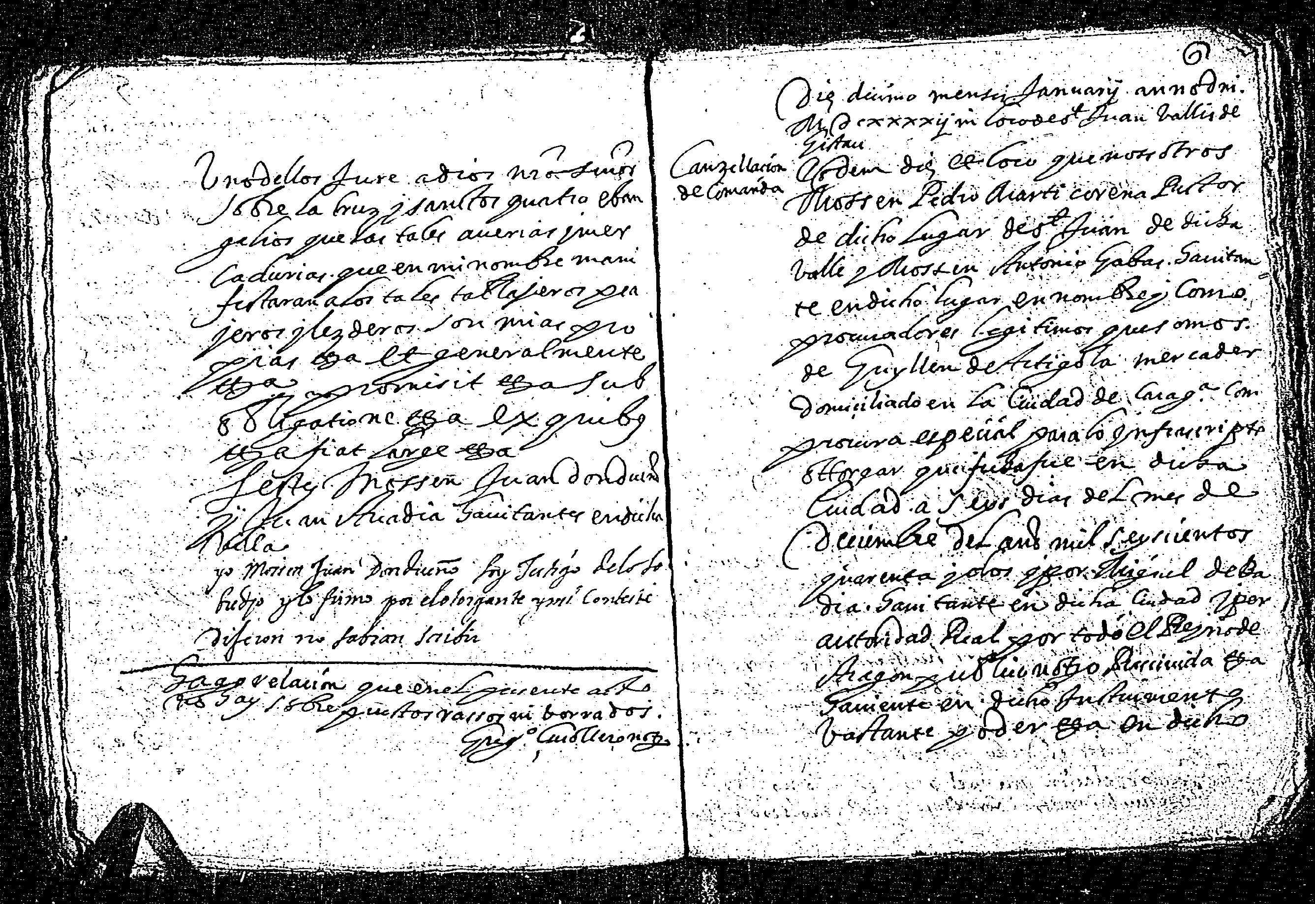 | Contenido: Pedro de Mur, vecino de la villa de Bielsa, constituye en sus procuradores a Juanes Salastro, Juan Saludas, Pedro Saludas, Juan Abadía, Pedro Encia, Juan Cordan y Miguel Palacin, habitantes en dicha villa para que presenten carta pública de franqueza por sus mercadurías. |