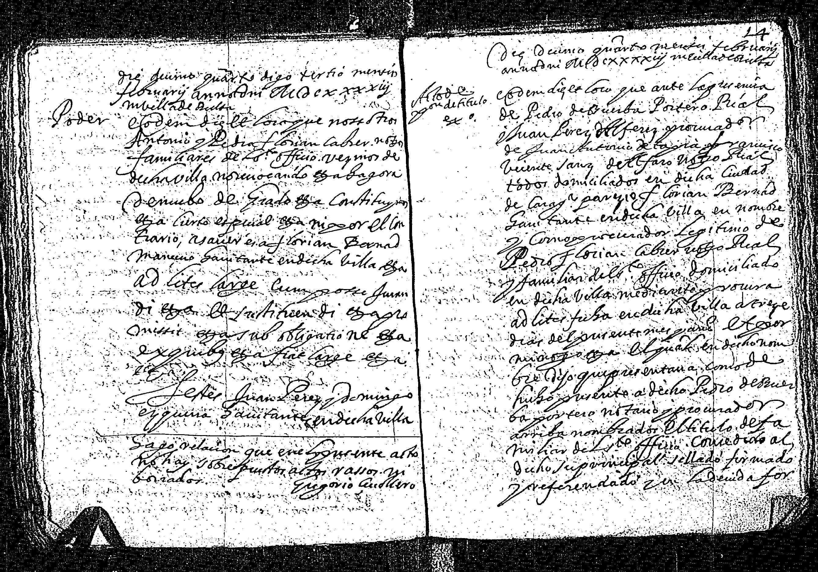 | Contenido: Antonio y Pedro Florian Cabrer, notarios, familiares del Santo Oficio, vecinos de la villa de Bielsa, hacen su procurador a mss. Florian Bernad, mancebo, habitante en dicha villa. |