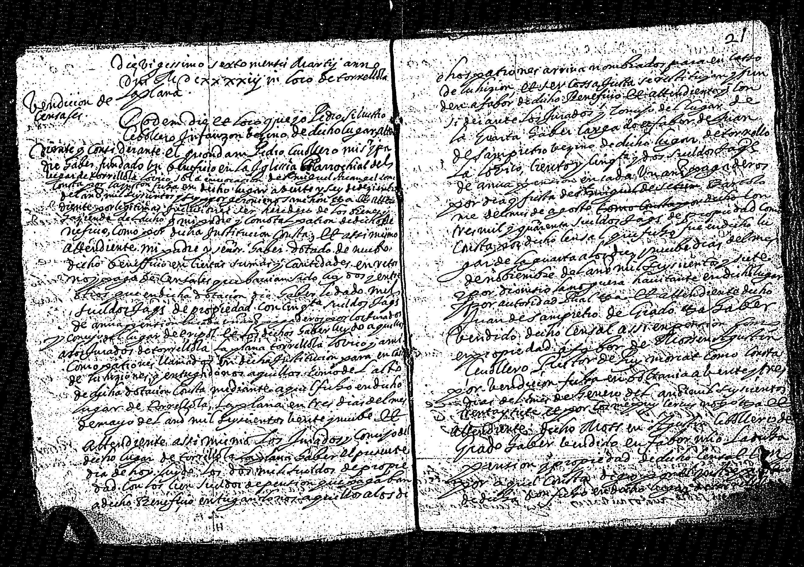 | Contenido: Pedro Silvestre Cebollero infanzón, vecino del lugar de Torrellosa de la Plana, atendiente su padre el quondam Pedro Cebollero fundo un beneficio de misas en la parroquial de dicho lugar a 26 de septiembre de 1606 y bajo la advocación de San Miguel Arcángel; y habiéndolo dotado con un censal cargado sobre el concejo del lugar de Eripoll de 50 s. de anual pensión y 1000 s. jaq. de propiedad hecho a 3 de mayo de 1639; y asimismo haber luido los jurados de Torrellosa de la plana un censal de propiedad 2000 s. jaq. con 100 s. de pensión que eran a favor de dicho beneficio; y asimismo el Concejo del lugar de la Guarta haberse cargado en favor de Juan Sampietro, vecino de Torrellosa, un censal de 152 s. de anual pensión pagaderos para San Bartolomé de Agosto con 3000 s. jaq. de propiedad, a fecha de 9 de septiembre de 1607; y habiendo vendido dicho censal a favor de mss. Agustín Cebollero, rector de Puy Morcat, y este a su vez haberlo vendido a favor del declarante, Pedro Silvestre Cebollero, a 25 del presente mes y año, venta supra calendada; Por tanto vende a favor de mss. Juan Cebolero, beneficiado del dicho Beneficio de beneficio de misas en la parroquial de Torrellosa, dicho censal por precio de 3040 s. jaq. y otros tantos de propiedad. |