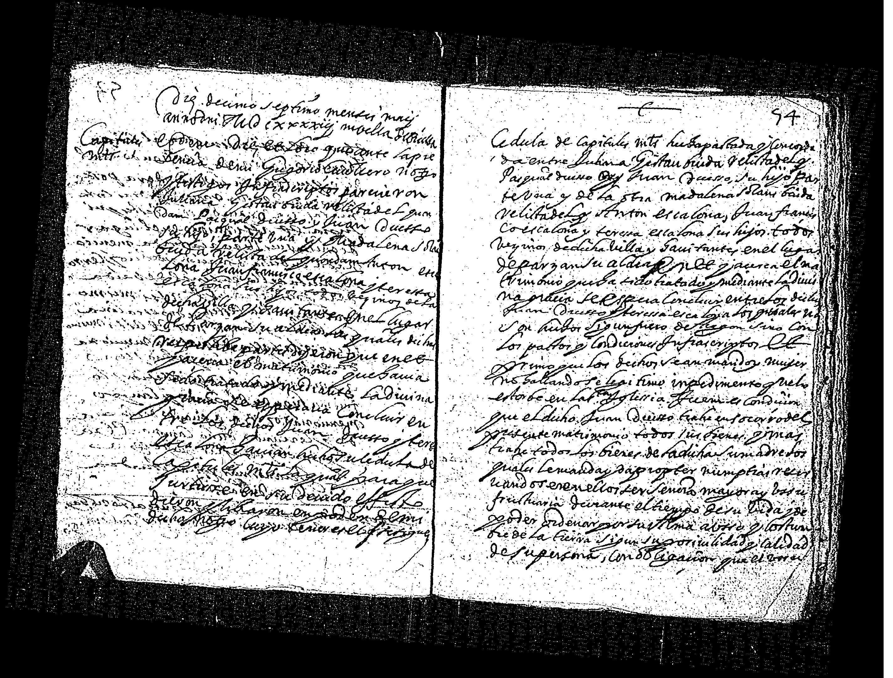 | Contenido: Comparecen de una parte Juliana Gistau, viuda de Pascual Duesso y Juan Duesso, su hijo; de la otra Magdalena Solans, viuda de Antón Escalona Juan Francisco Escalona y Teressa Escalona, sus hijos; todos vecinos de Parzan, aldea de Bielsa; para capitular matrimonio entre Juan Duesso y Teressa Escalona. |