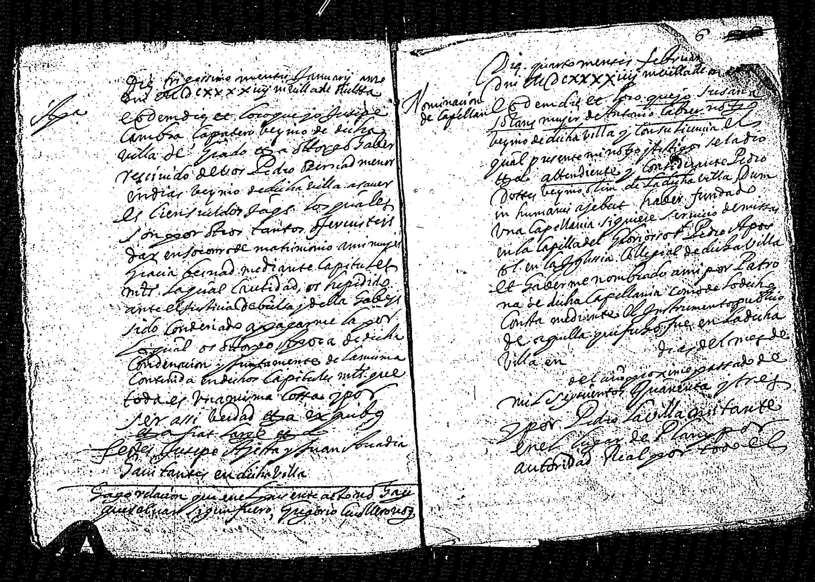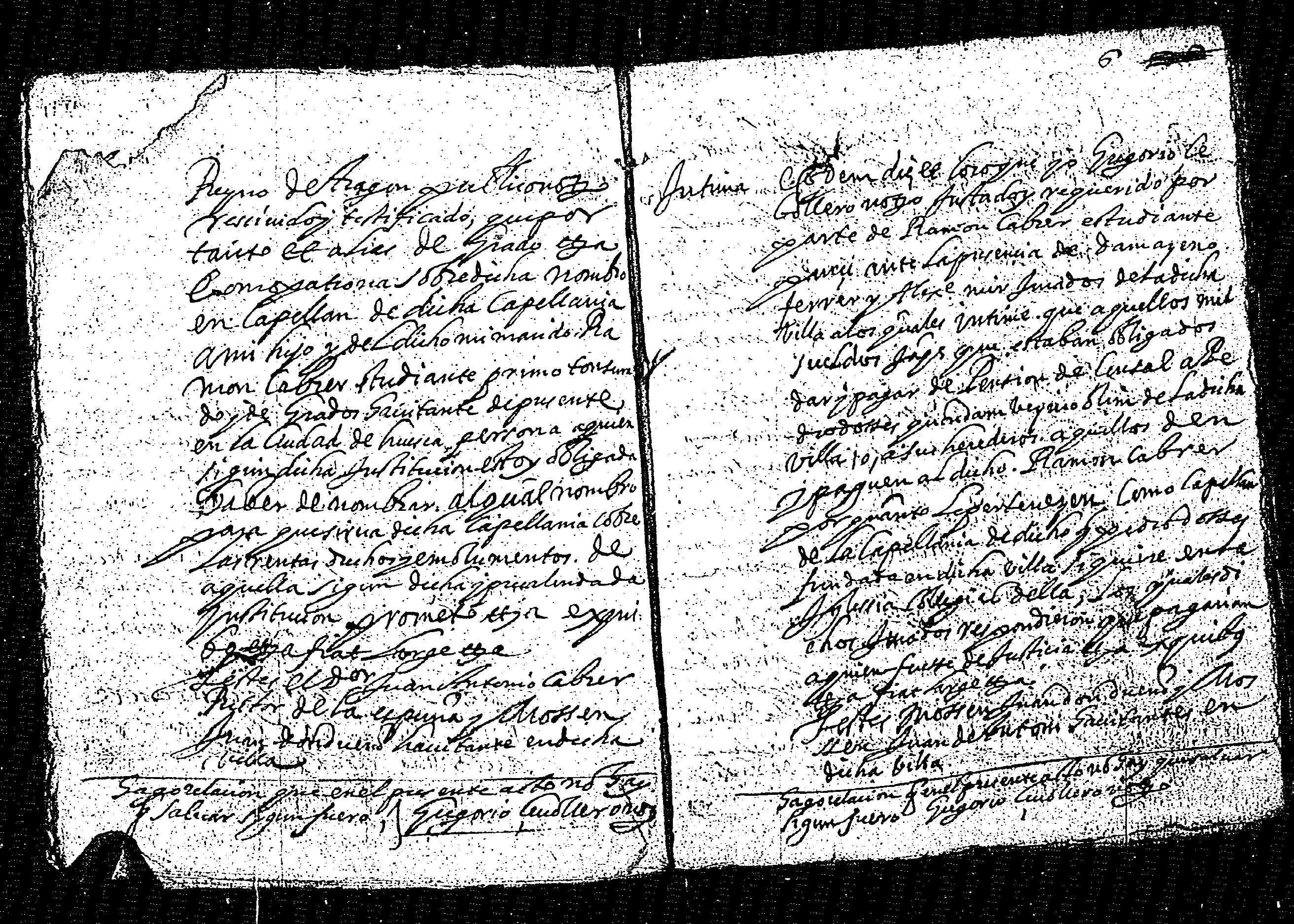 | Contenido: Susana Solans, mujer de Antonio Cabrer, notario, vecino de la villa de Bielsa, atendiente que Pedro Dosses, vecino olim de la villa fundó una capellanía siquiere servicio de misas, a la advocación de San Pedro Apostol en la colegial de dicha villa el año pasado de 1643, y haberla nombrado a ella patrona de dicha capellanía, nombra patrón de dicha capellanía a su hijo y de su marido Antonio Cabrer, Ramón Cabrer, estudiante tonsurado, habitante en la ciudad de Huesca. |
