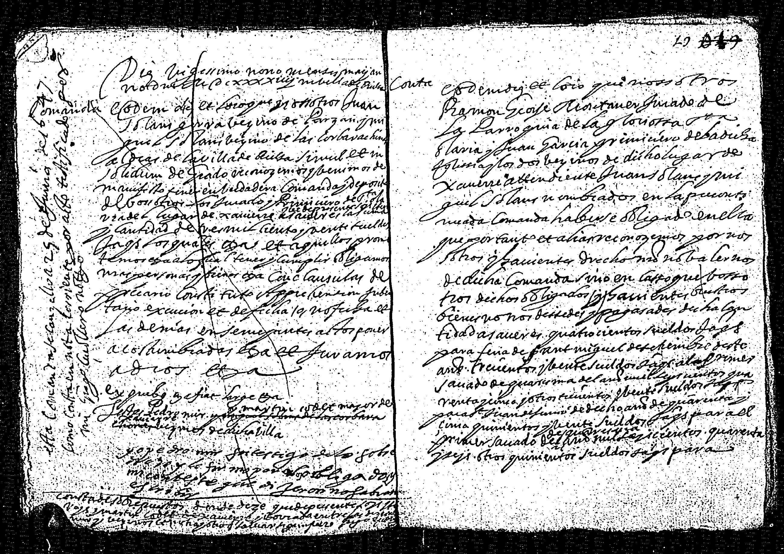 | Contenido: [tachada] Juan Solans Gorra vecino de Parzán y Miguel Solans, vecino de las Covarachinas, aldeas de la villa de Bielsa, reconocen tener comanda a favor de los jurados y primiciero del lugar de Xavierre la suma de 3120 s. jaq. |