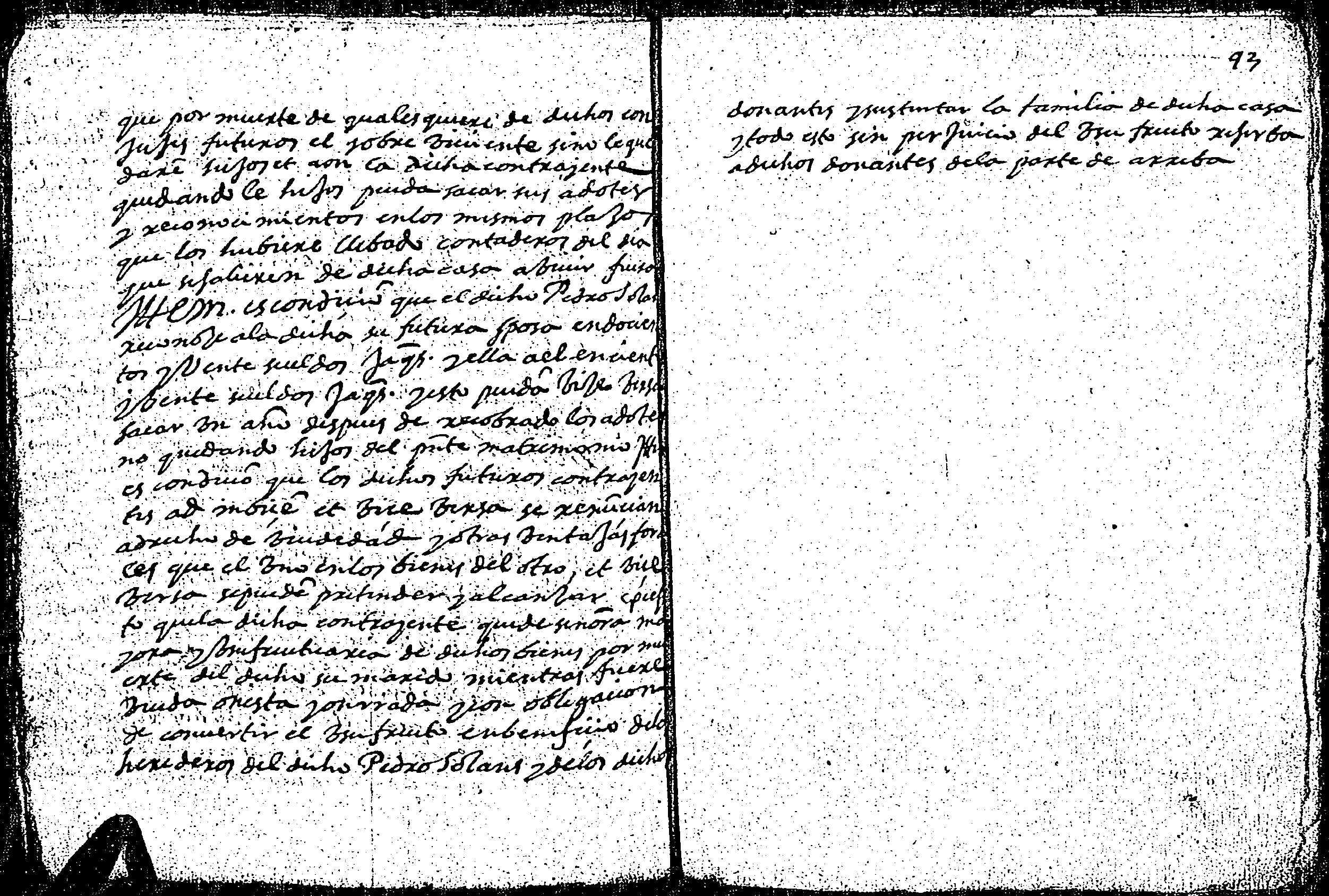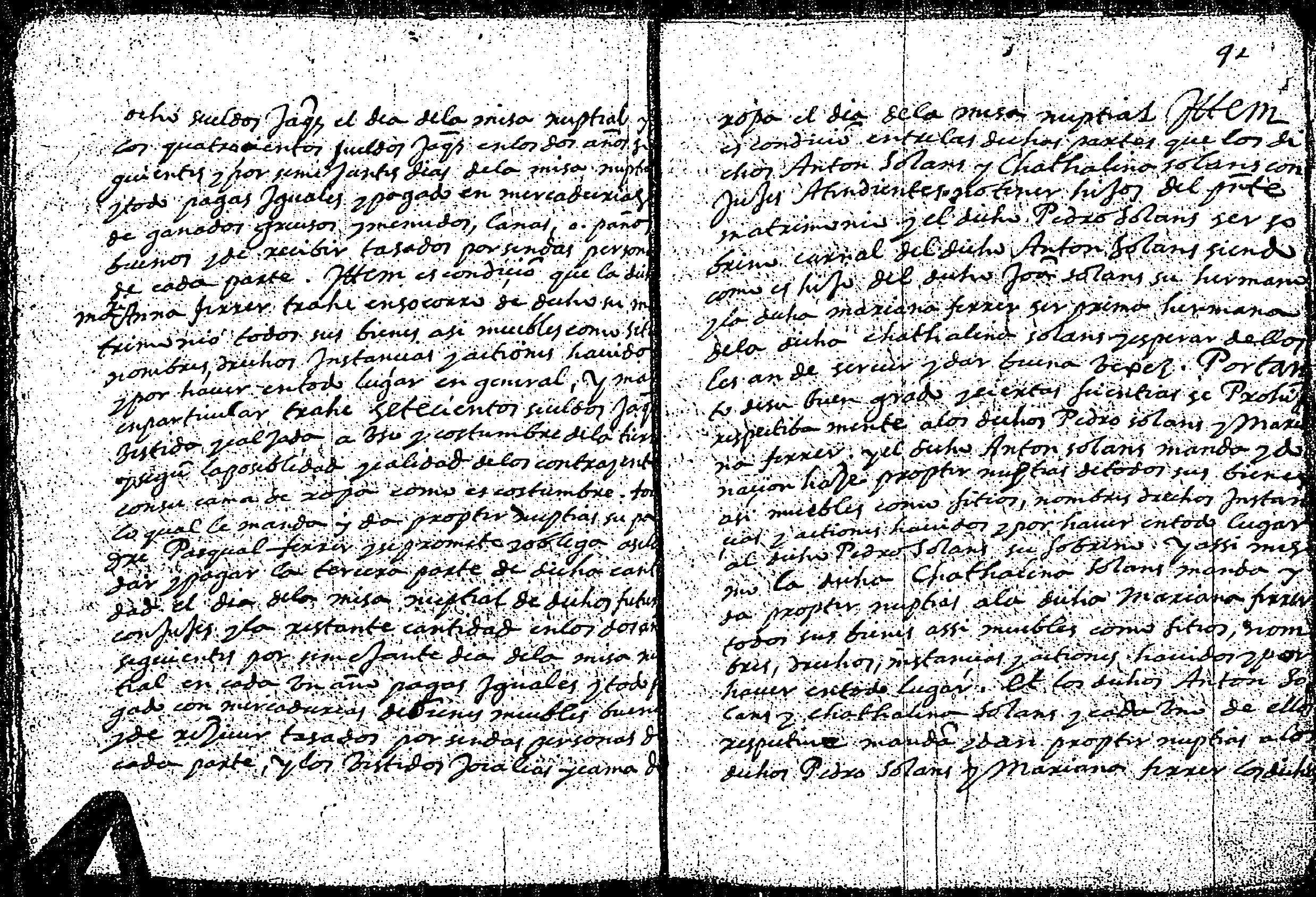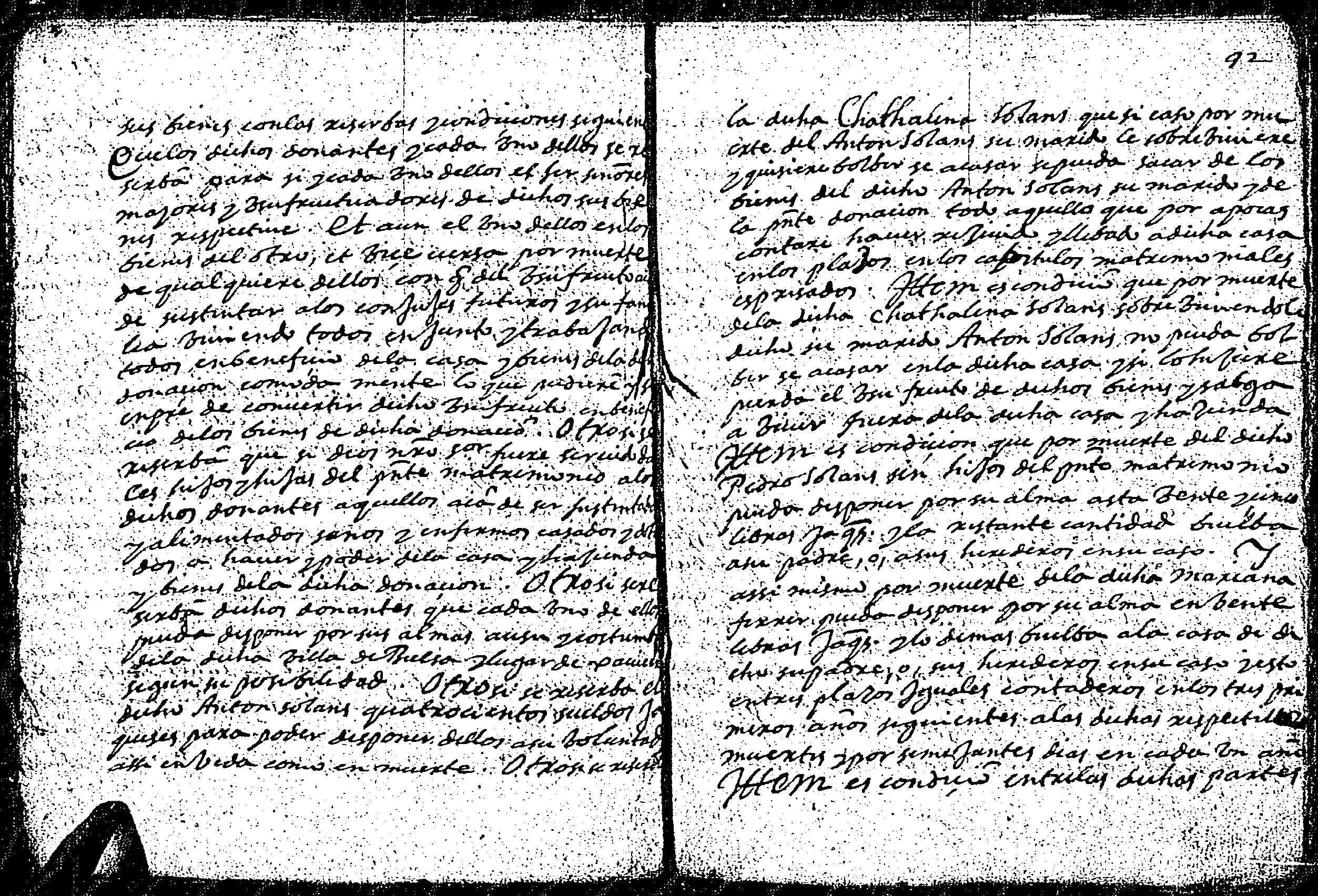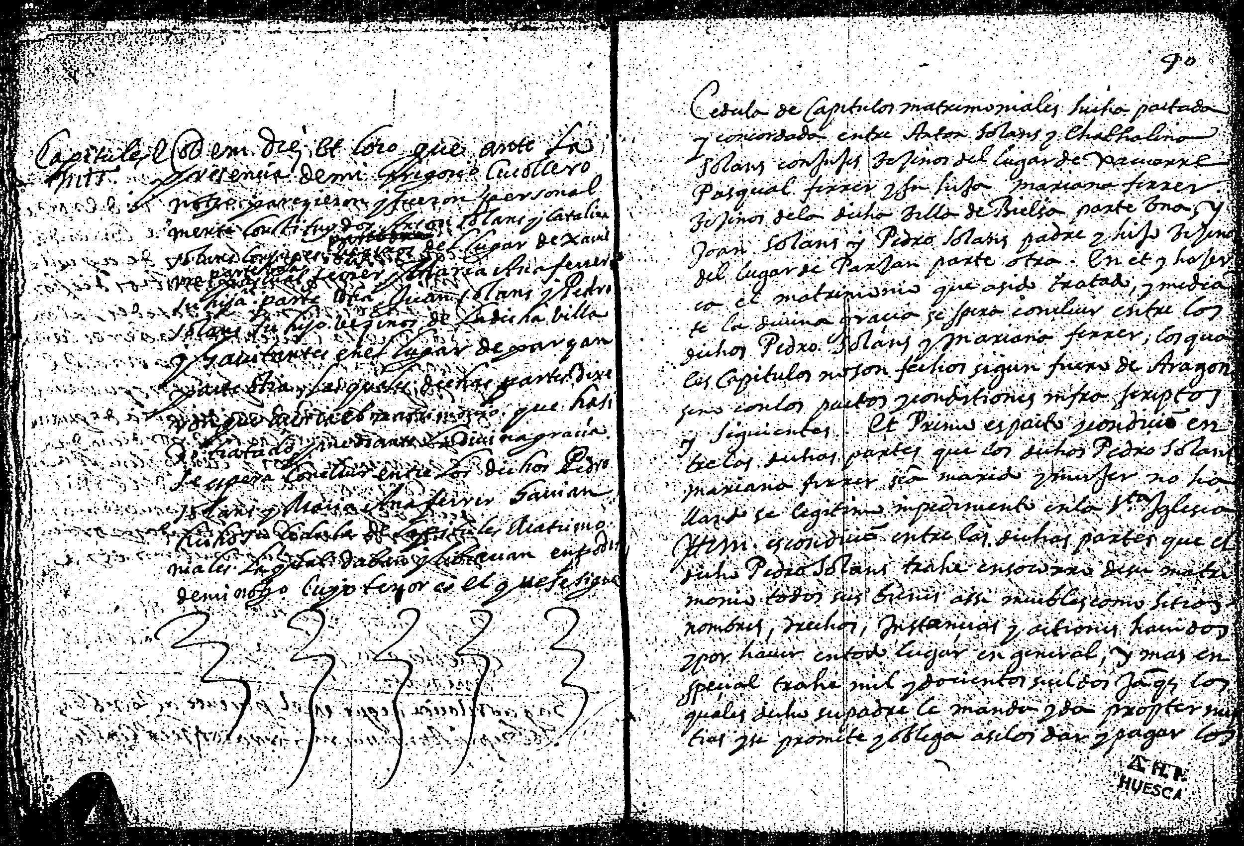 | Contenido: Constituidos de una parte Antón Solans y Catalina Solans cónyuges vecinos de Parzán y de la otra Pascual Ferrer y María Ana Ferre, vecina de Lascuarre su hija para capitular matrimonio entre Pedro Solans vecino de Parzán y Mariana Ferrer. |