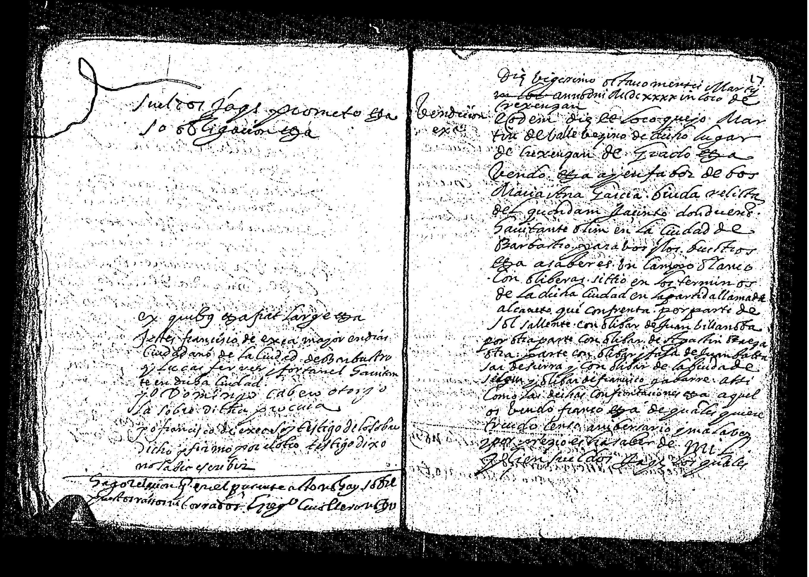 | Contenido: Martín de Valle vecino de Crexençan a Mariana García viuda de Jacinto Dondueño habitante olim en la ciudad de Barbastro un campo blanco con oliveras de la partida alcaneto de Barbastro por precio de 1100 sueldos jaqueses. |