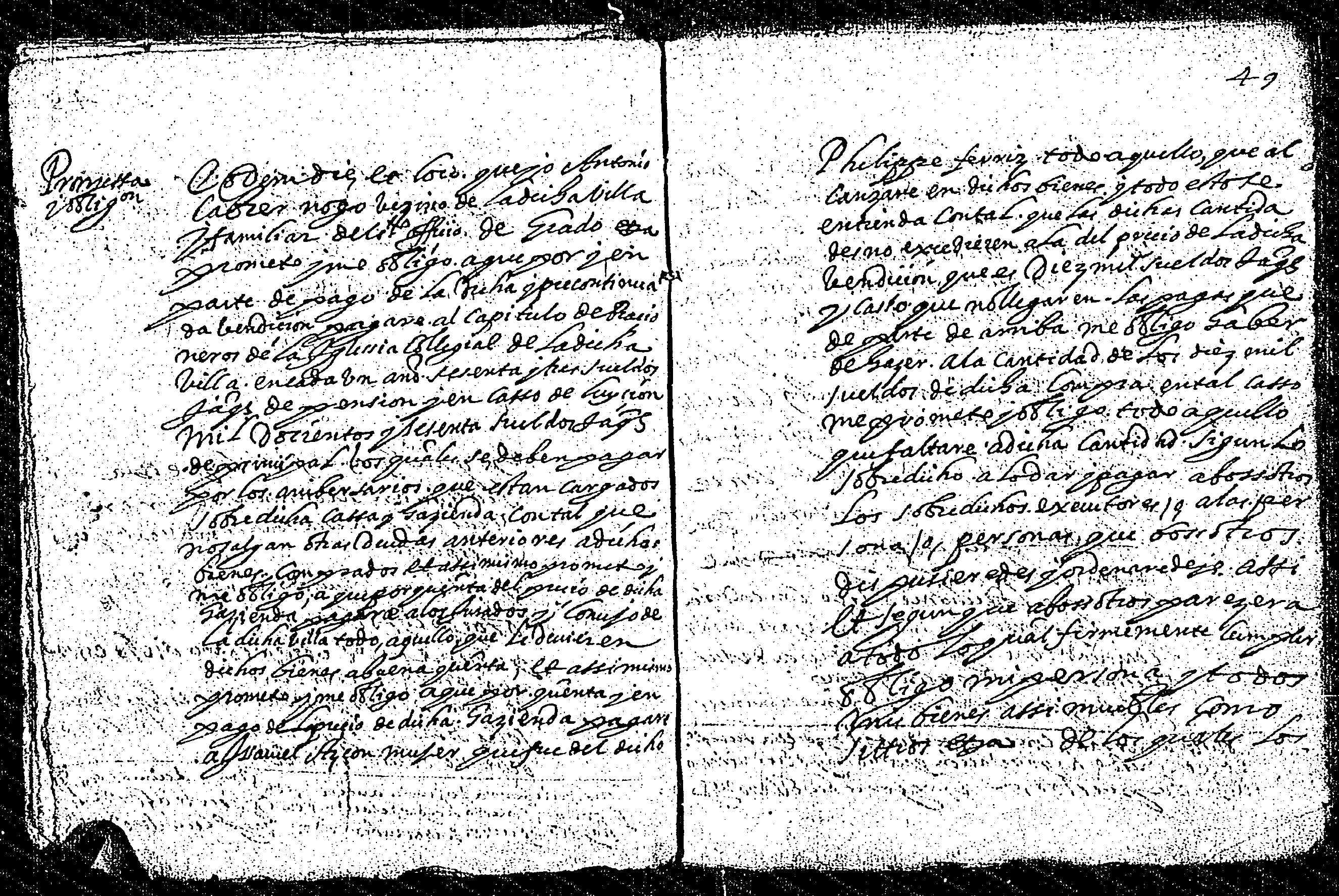 | Contenido: Antonio Cabrer notario familiar del Santo Oficio vecino de la villa de Bielsa se obliga por pago de la precalendada vendición al capitulo de racioneros de la villa de Bielsa pagar 63 sueldos de pensión en cada un año y en caso de luición 1200 sueldos jaqueses. |