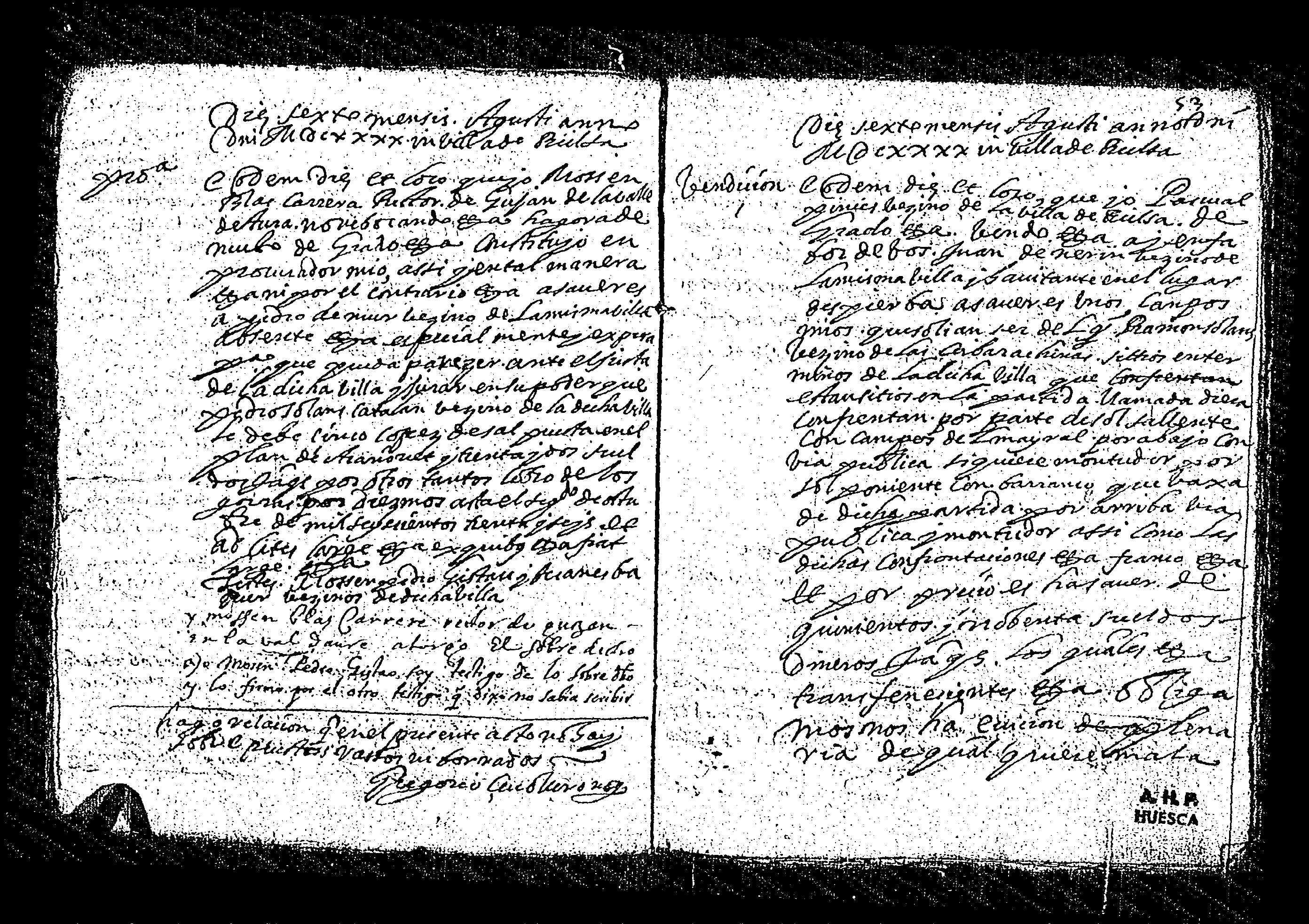 | Contenido: Pascual Pinies, vecino de la villa de Bielsa vende a favor de Juan de Nerín, vecino de la villa y habitante en Espierba unos campos sitos en las Covarachinas por precio de 590 s. jaq. |