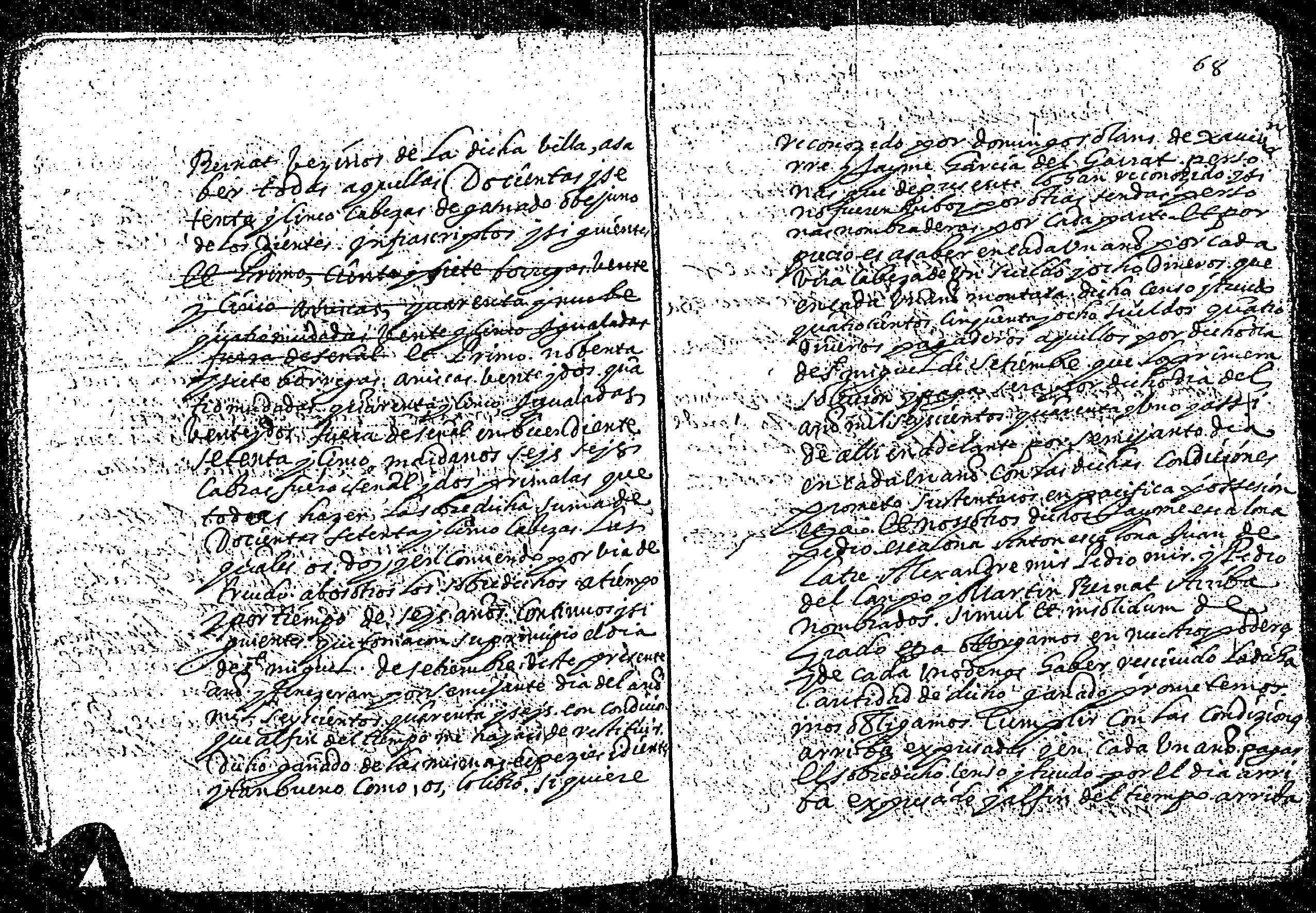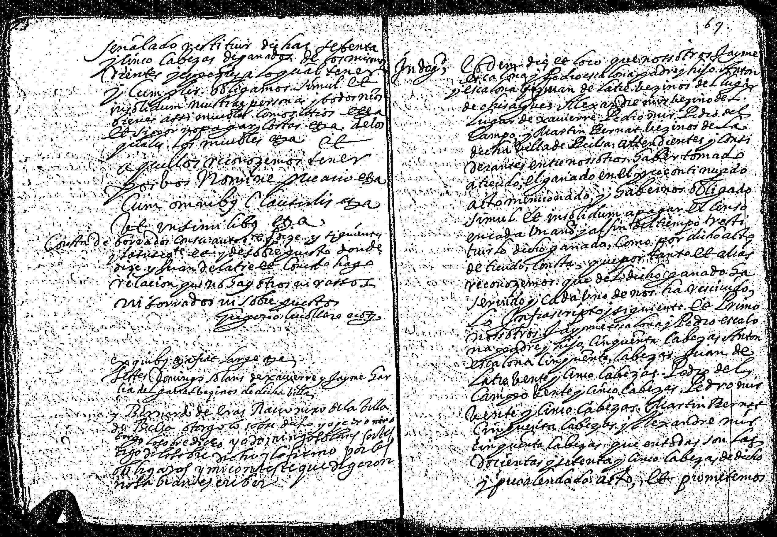 | Contenido: Mss. Bernardo Heras, racionero de la colegial de la villa de Bielsa da a treudo a Jayme Escalona y Pedro Escalona, padre e hijo, y a Antón Escalona, yerno de Juan de Latre, vecinos de Chisagues, Alexandre Mir, vecino de Xavierre, Pedro del Campo y Martín Bernat, vecinos de Bielsa 275 cabezas de ganado ovejuno y cabrio por tiempo de 6 años continuos y por cada cabeza 1 s. 8 d. jaq. al año. |