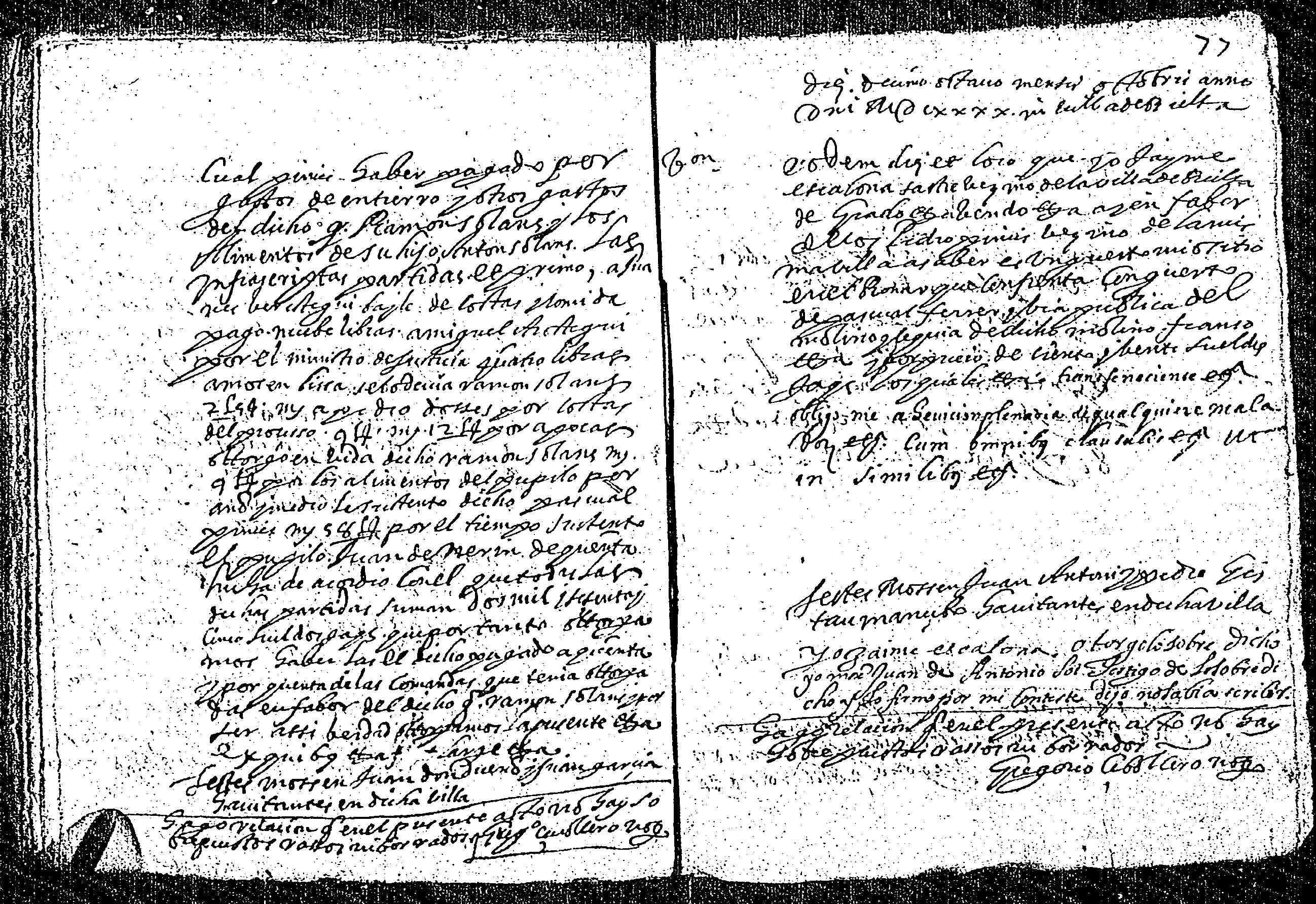 | Contenido: Florián Cruzado, lugarteniente de justicia y juez ordinario de la villa de Bielsa y Pedro Bernad de la Barrana, jurado de la villa y como tales habientes de derecho sobrec los bienes que fueron del qd. Ramón Solans, olim vecino de la villa según su testamento dado en 1631 por el presente notario, dan por calendadas las comandas hechas para pagar el entierro de dicho Ramón Solans y la manutención del hijo de este Anton Solans, que son de 180 s. jaq. a Miguel de Arostegui, 80 s. a Mss. Lissa, 44 s. a Ramón Solans por gastos del proceso, por lo mismo a Pedro Dosees 192 s. y 760 s. en diversas apocas que en vida debía el dicho Ramón Solans; suman todas 2075 s. jaq. |