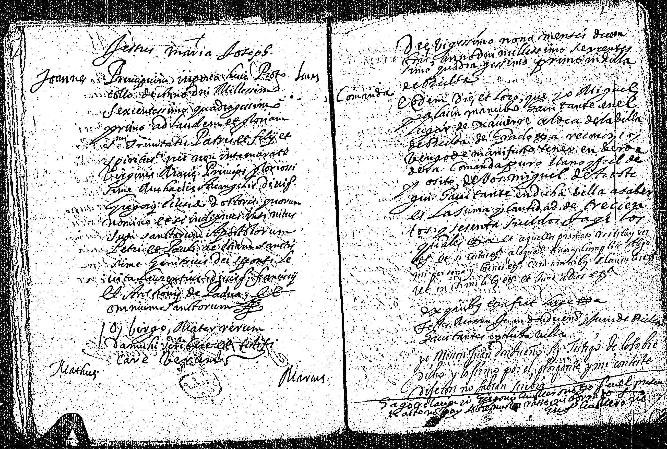 | Contenido: Miguel Palacín, mancebo, habitante en el lugar de Xavierre, aldea de Bielsa, reconoce tener comanda a favor de Miguel de Arostegui, habitante en dicha villa, por la suma de 360 s. |