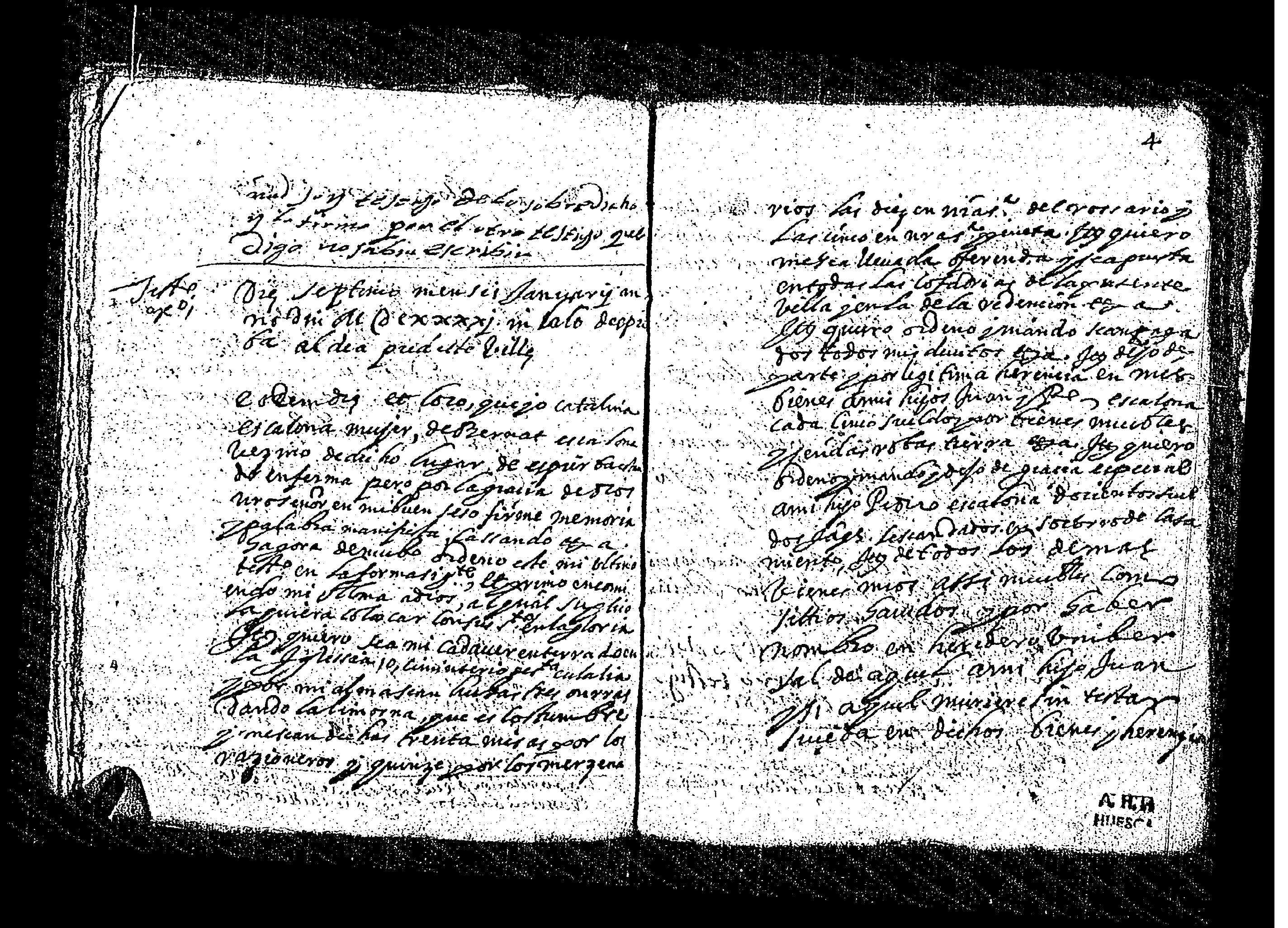 | Contenido: Testamento otorgado por Cathalina Escalona, mujer de Bernad Escalona, vecino de Espierba. Desea ser enterrada en Santa Eulalia dando la limosna de costumbre, 30 misas por los racioneros de la colegial de Bielsa y 15 por los mercedarios, dando ofrendas en las cofradías de la villa, nombra heredero universal a su hijo Juan y a su hijo pedro gracia de 200 s. jaq. Nombra tutores a su marido y a Ramón Solans de las Covarachinas. |