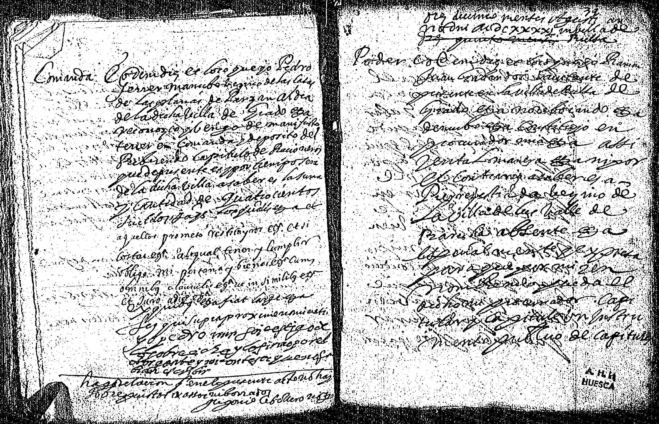 | Contenido: Pedro Ferrer, mancebo, vecino de Las Planas en las casas de Parzan, reconoce tener comanda a favor del capitulo de racioneros de la villa de Bielsa por 400 s. |