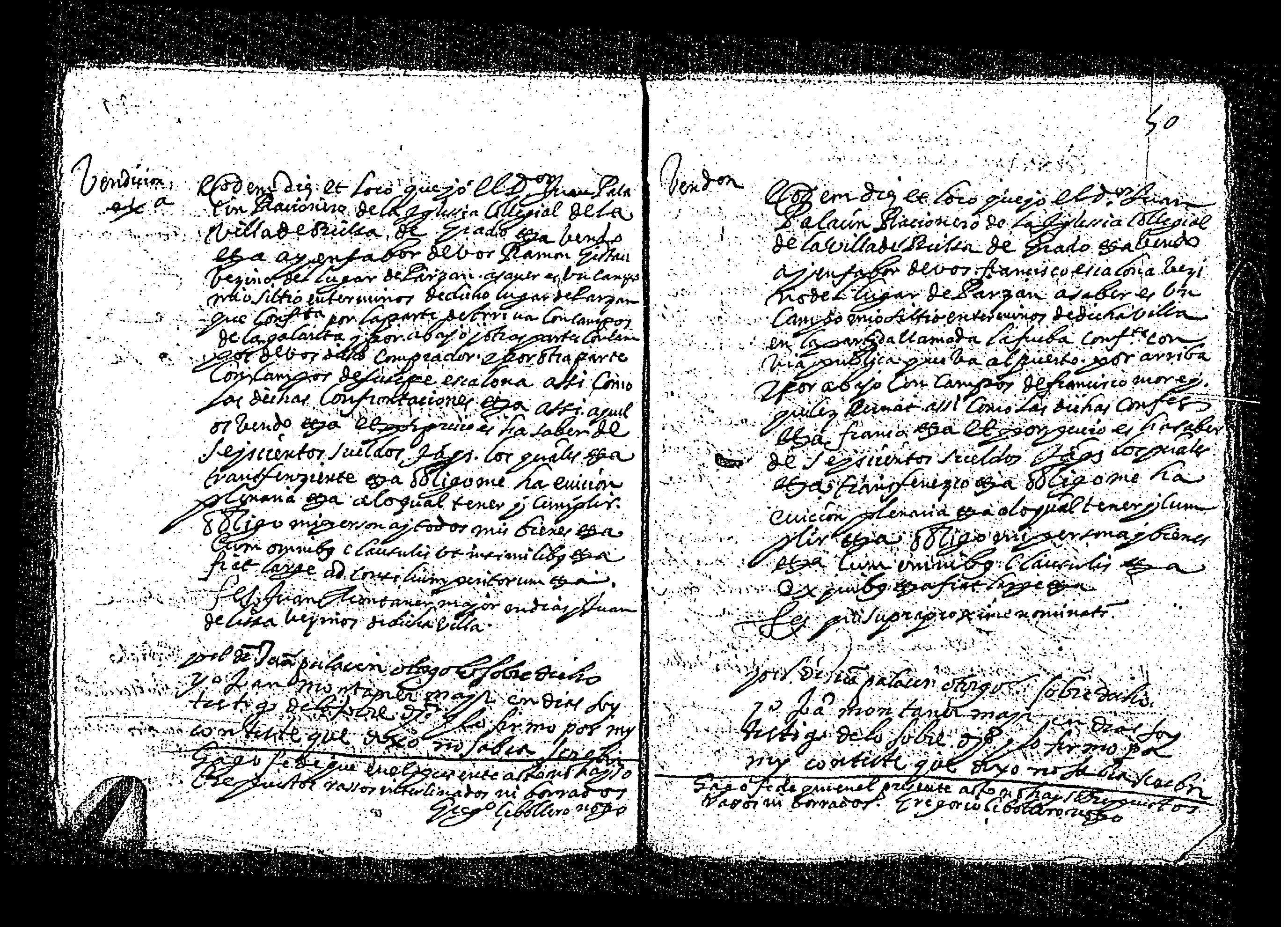 | Contenido: Mss. Juan Palacin, racionero de la colegial de la villa de Bielsa, vende a Ramon Gistain, vecino de Parzan, un campo sito en Parzan por 600 s. |
