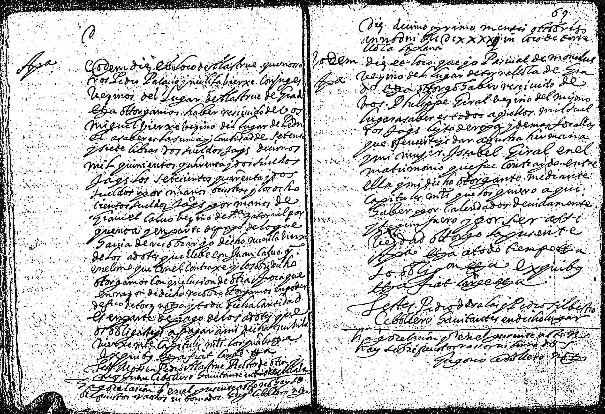 | Contenido: Pedro Palacio y Nubila Bierxe, vecinos de Alastrué, reconocen haber recibido de Migfuel Bierxe, vecino del lugar de Pedrón la suma de 1540 s., 740 s. por sus manos y 800 s. de Migel Calvo vecino de Sazatornil en cuenta de lo que le debía a Migel Calvo. |