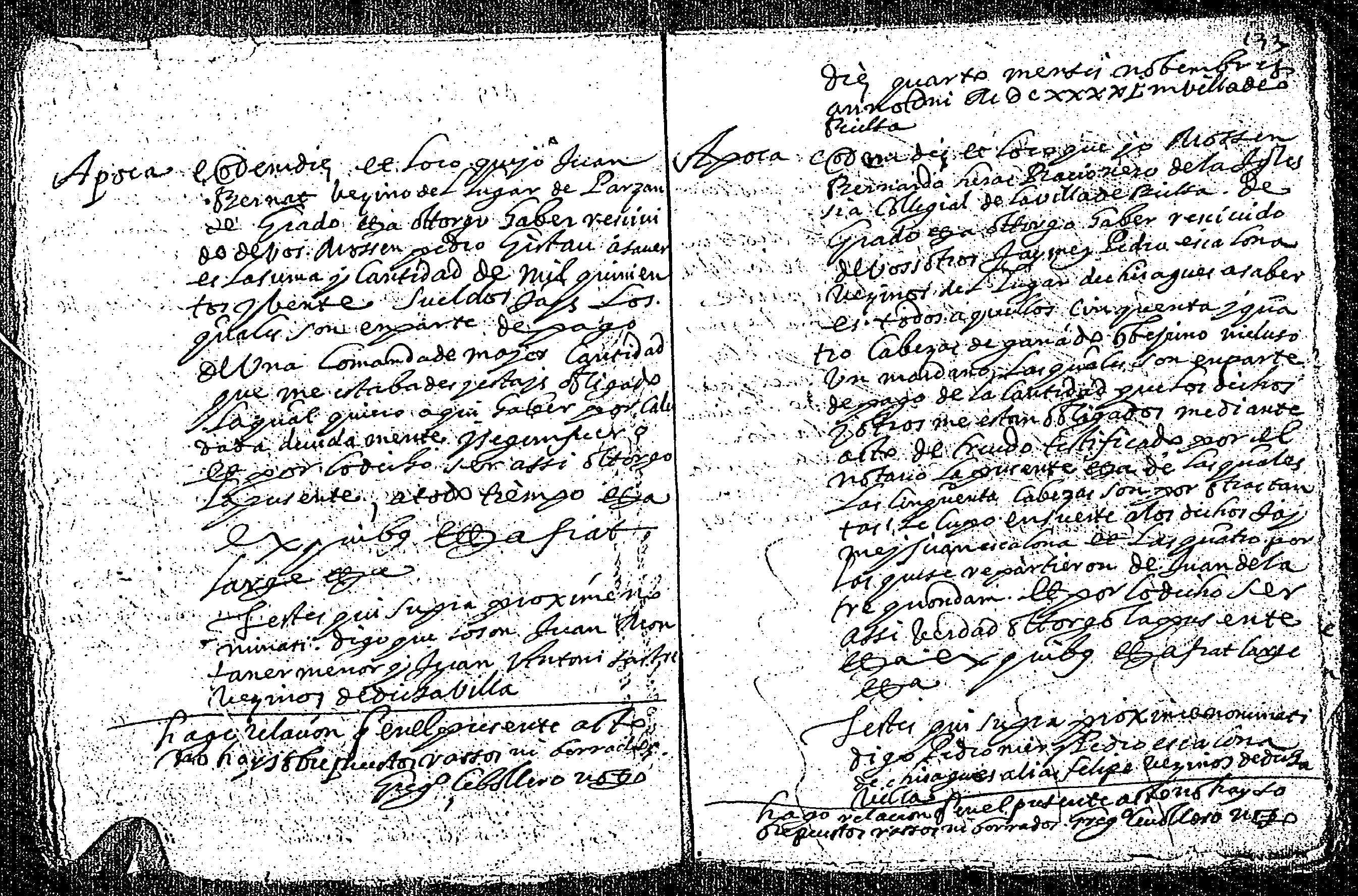 | Contenido: Juan Bernat, vecino de Parzan otorga haber recibido de mss. Pedro Gistau 1.520 s. parte de una comanda mayor. |