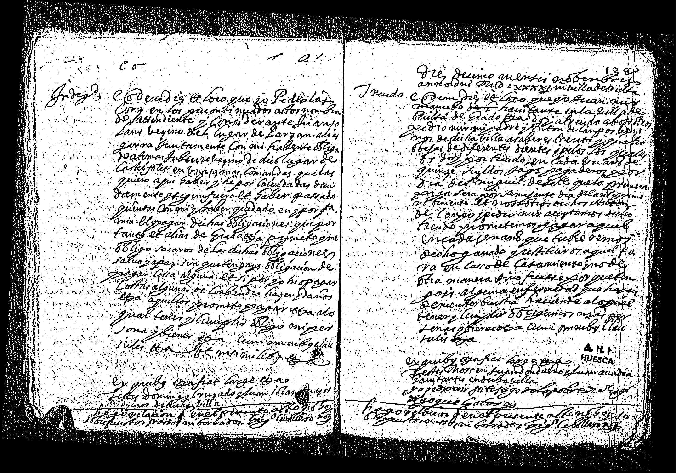| Contenido: Juan Mir, mancebo habitante en Bielsa deja a treudo a Pedro Mir padre y Anton Campos, vecinos de Bielsa, 34 ovejas por 15 s. anuales en total pagaderos para San Miguel de septiembre, con la condicion de que le sean devueltas si contrae matrimonio. |