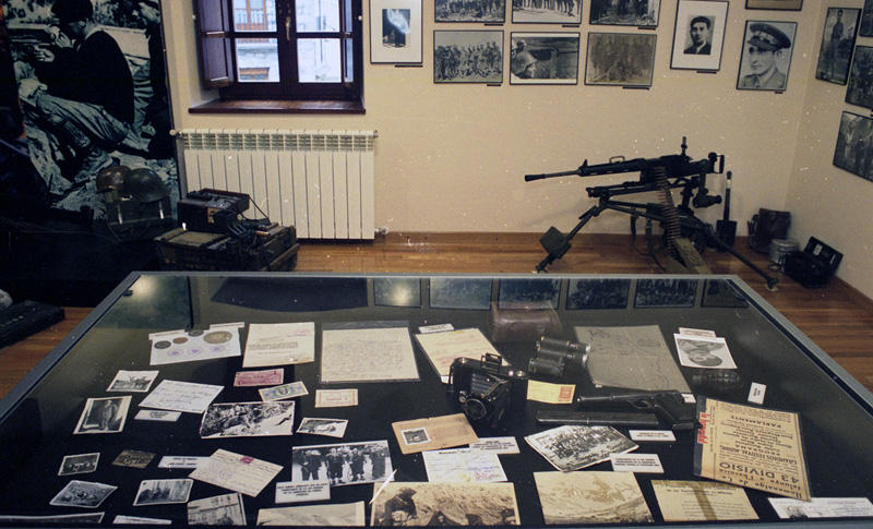 | Contenido: Mesa donde se exponen fotografías de pequeño tamaño, documentación manuscrita diversa, cámaras fotográficas y armas ligeras, todo ello relacionado con la Bolsa de Bielsa. |