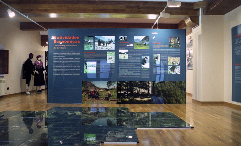 | Contenido: Fotografía aérea del valle (en el suelo) y paneles de la sección dedicada a la vida tradicional en el valle (actividades económicas). |