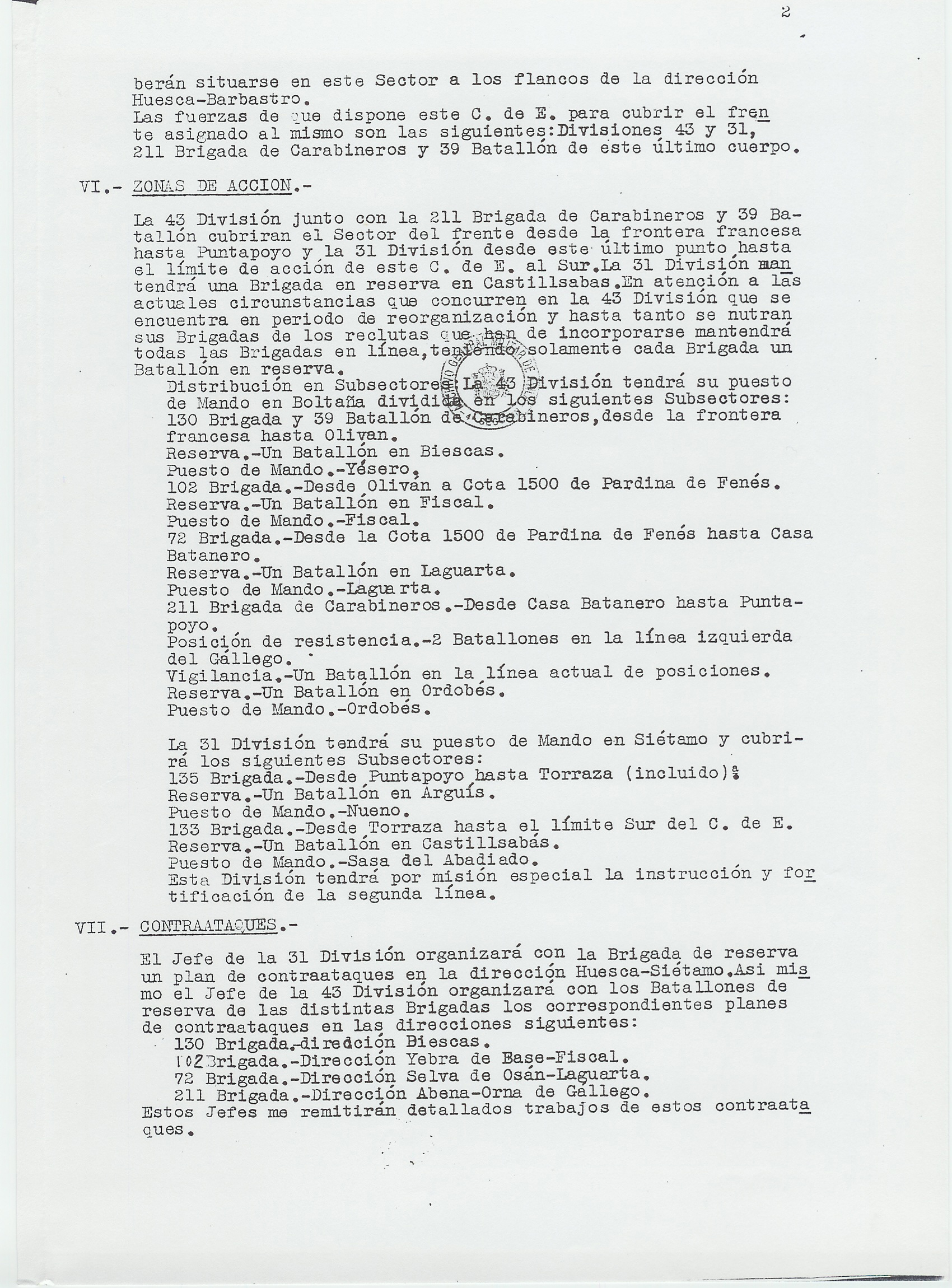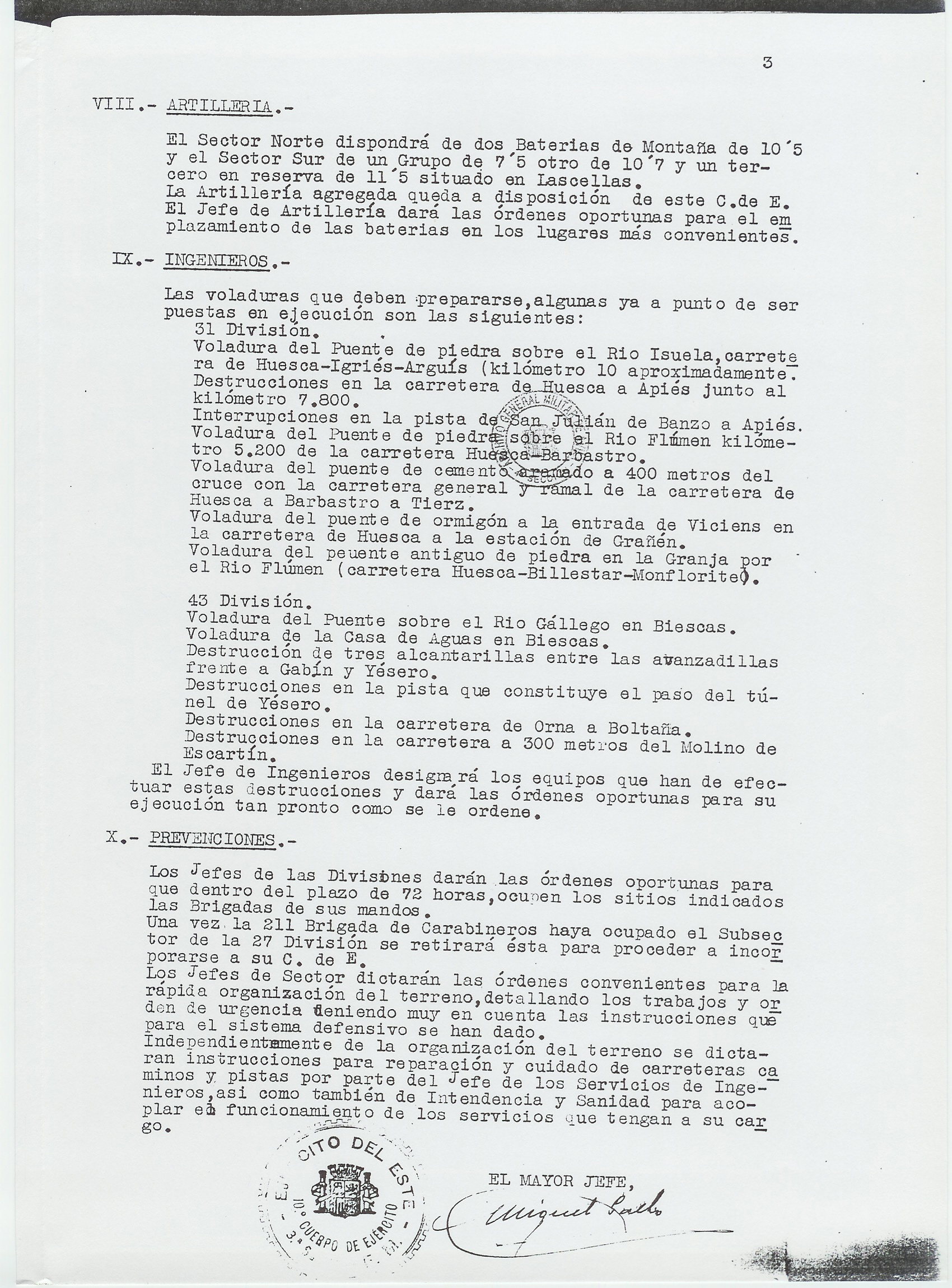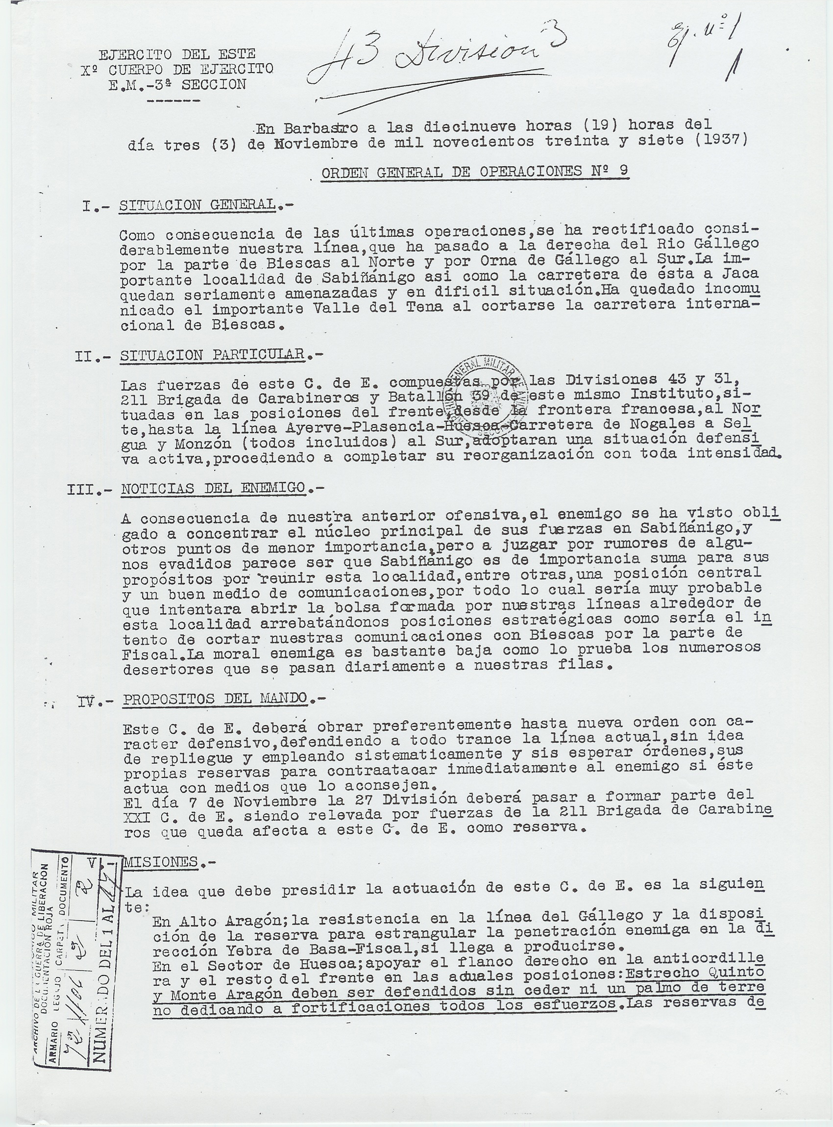 | Contenido: Se establece la línea general de resistencia en el frente norte de Aragón. El X Cuerpo de Ejército cuenta con las divisiones 43 y 31, así como la 211 Brigada de Carabineros y el 39 Batallón. Se describe el despliegue previsto en subsectores y establecimiento de puestos de mando. Los contraataques previstos se detallan solo para las brigadas 130ª, 102ª 72ª y 211ª de la 43ª División, dejando al mando divisional el plan detallado. Se incluye el plan de voladuras de puentes. |