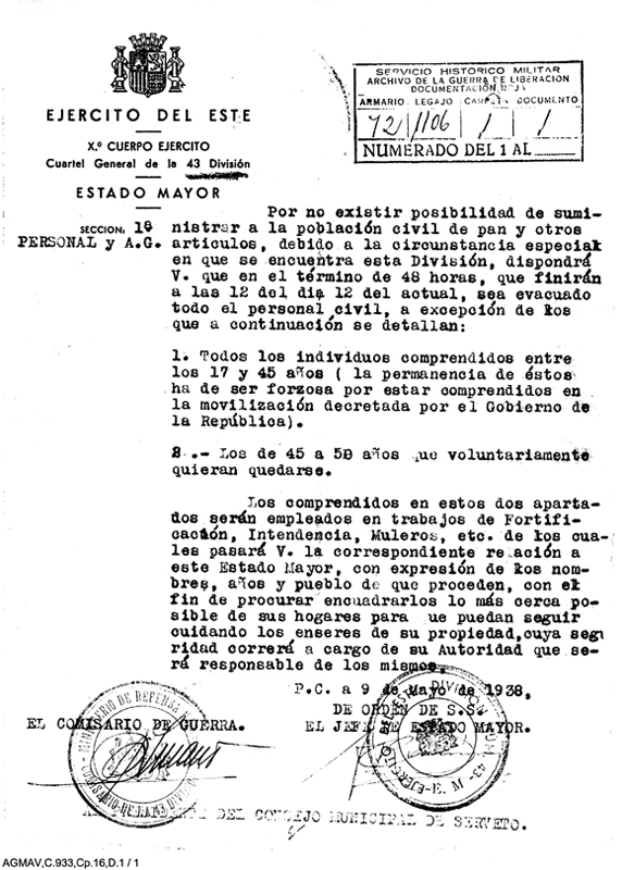 | Contenido: Escrito del estado mayor dirigido al alcalde del concejo municipal de Serveto sobre la evacuación de la población civil de Serveto, ante la imposibilidad del suministro de víveres. |