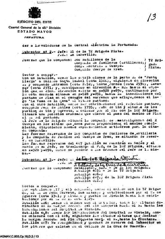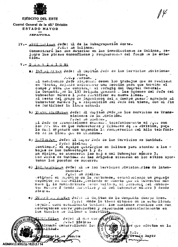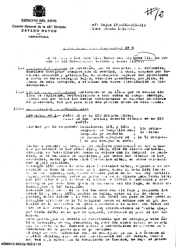 | Contenido: Orden general de operaciones número 9. Ante la gran ofensiva del ejército franquista, apoyado con numerosa aviación, se dispone, para asegurar la defensa, una nueva redistribución de subsectores de las diferentes brigadas, manteniendo las posiciones sin idea de repliegue y contraatacando sin necesidad de orden de la jefatura mayor de la división. Se encarga al jefe de la 130ª Brigada Mixta dar la orden, cuando sea preciso, al capitán Anguita de volar la central eléctrica de Lafortunada. |