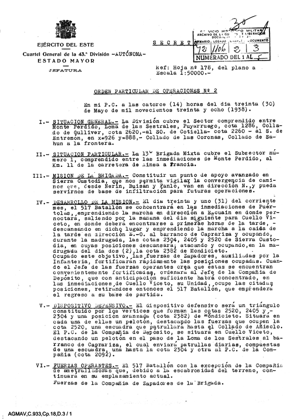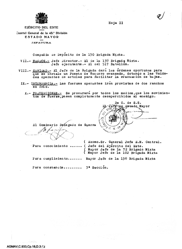 | Contenido: Orden particular de operaciones número 2, dirigida a la 130ª Brigada Mixta. Se ordena que esta brigada constituya un punto de apoyo avanzado en Sierra Custodia a fin de vigilar las comunicaciones. Se distribuyen los batallones y compañías para la consecución de la orden. |