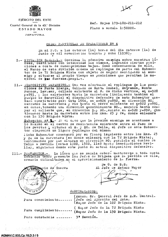 | Contenido: Orden particular de operaciones número 4, dirigida a la 72ª y 130ª brigadas mixtas. Se ordena un repliegue de la línea de la 72ª Brigada Mixta debido a la constante ofensiva del ejército franquista. |
