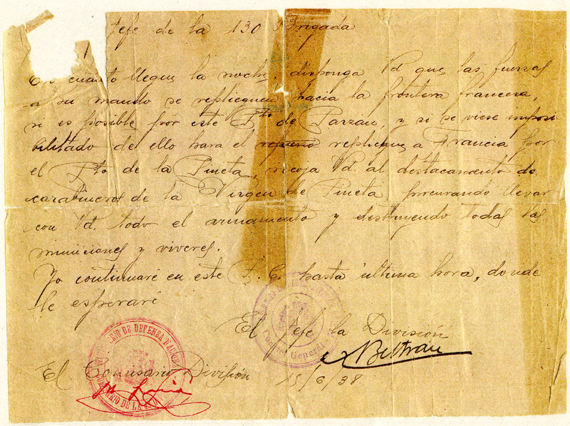 | Contenido: Orden al jefe de la 130ª Brigada Mixta, Juan Lacasa Lardiés, de retirarse hacia Francia por Parzán, recogiendo todo el armamento y destruyendo municiones y víveres. |