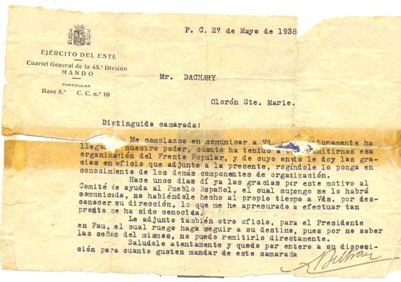 | Contenido: Particular de Antonio Beltrán a Mr. Dachary en Olorón agradeciéndole un envío, probablemente de material, procedente del Frente Popular. |