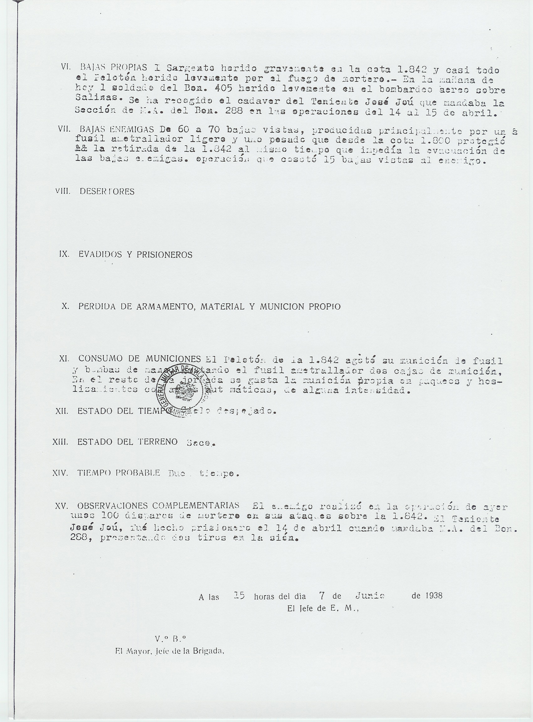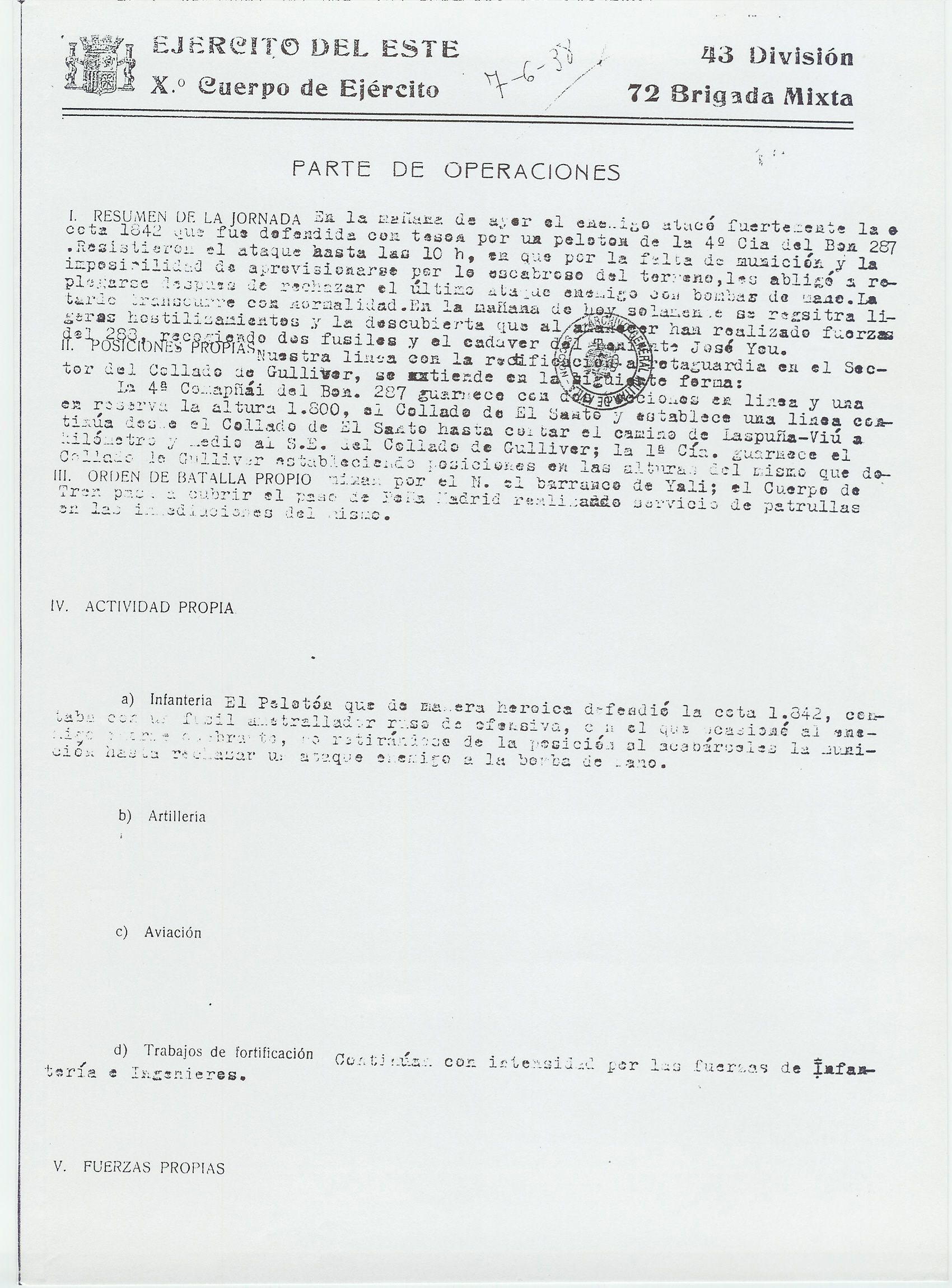 | Contenido: Parte en el que se informa de la defensa de las posiciones que la brigada ocupaba en la zona de Laspuña-Vió, concretamente la cota 1842. Se describe asimismo el despliegue de cada unidad de la brigada y diversos aspectos de la defensa en curso. |