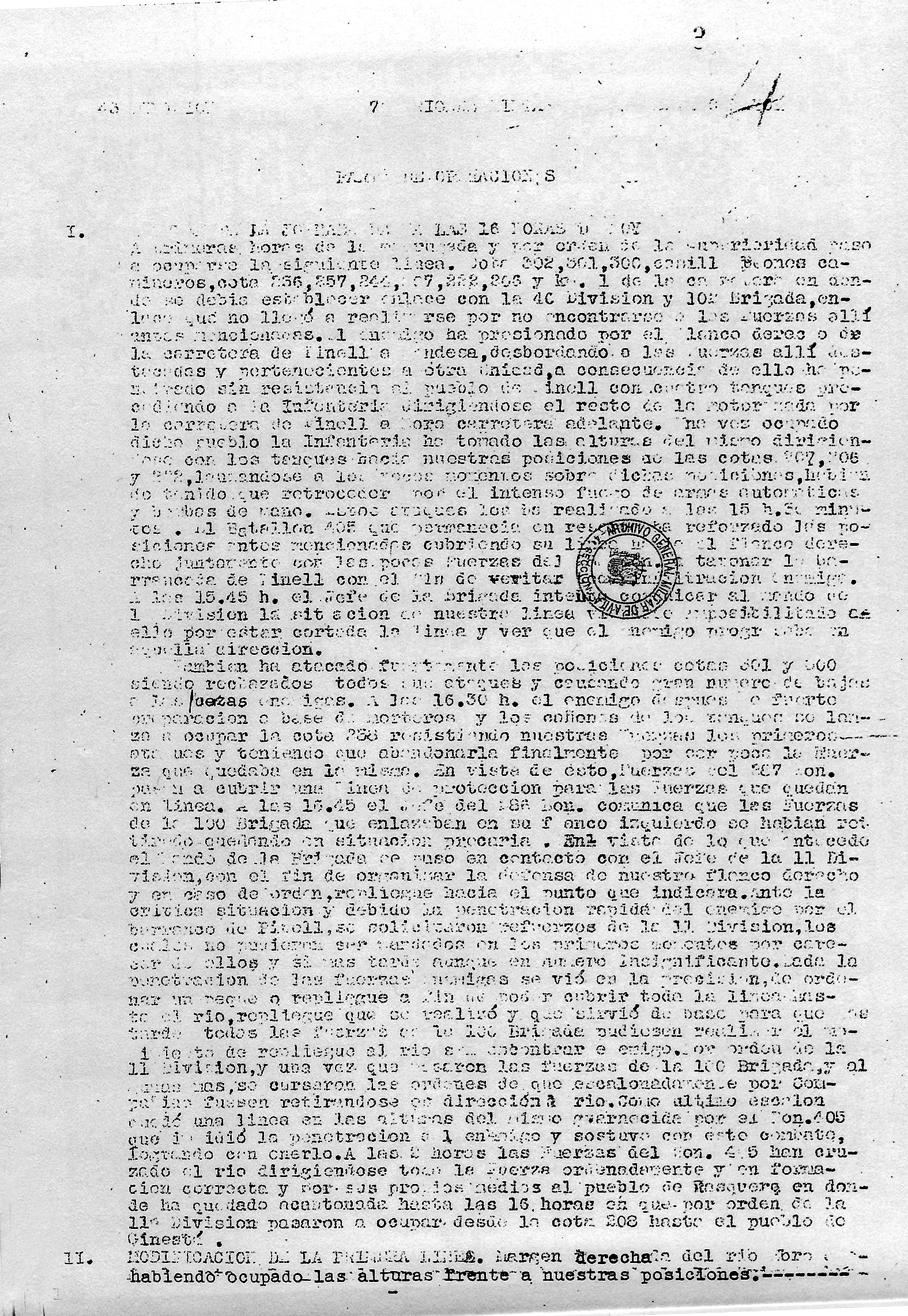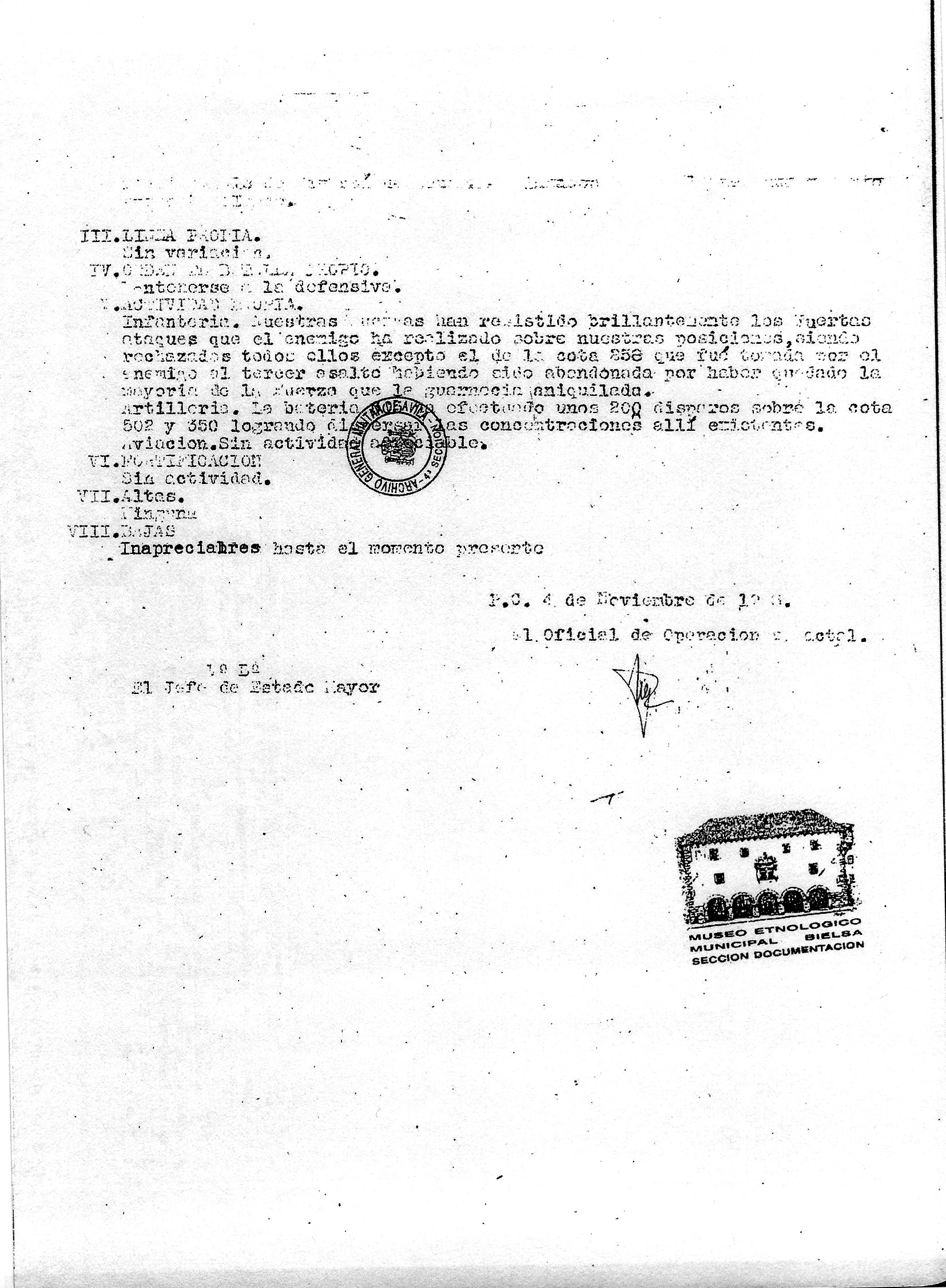 | Contenido: Se describen los trabajos de fortificación de las cotas 302, 301 y 300. Se anota la penetración de fuerzas enemigas apoyadas por carros blindados. Se pierde la cota 258. Se registra actividad aérea de los dos bandos en la zona. |