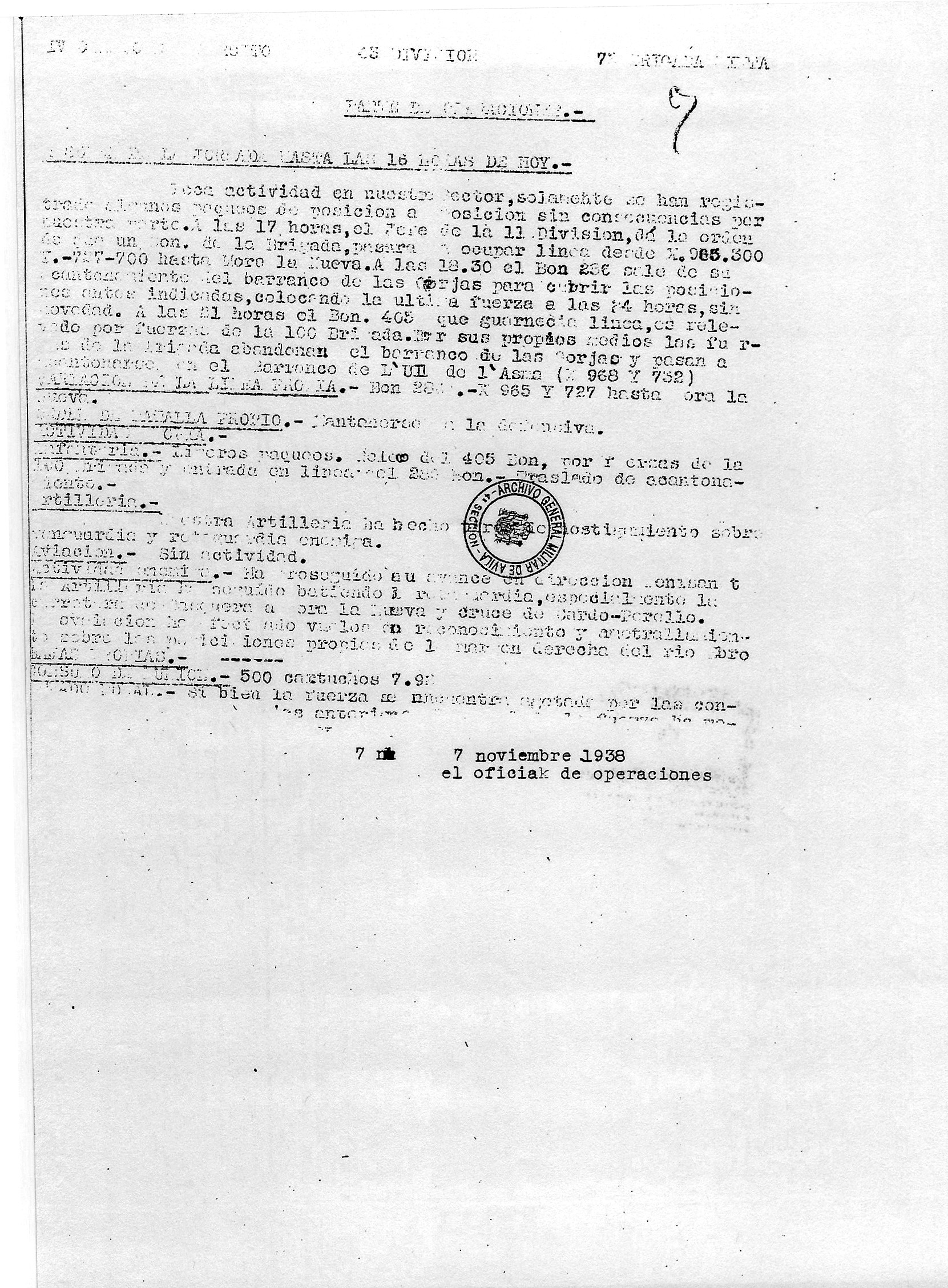 | Contenido: Se informa de escasa actividad en el frente, con salidas esporádicas de las unidades acantonadas en el barranco de las Gorjas para apoyar las operaciones. El Batallón 405º es relevado por fuerzas de la 100ª Brigada. |