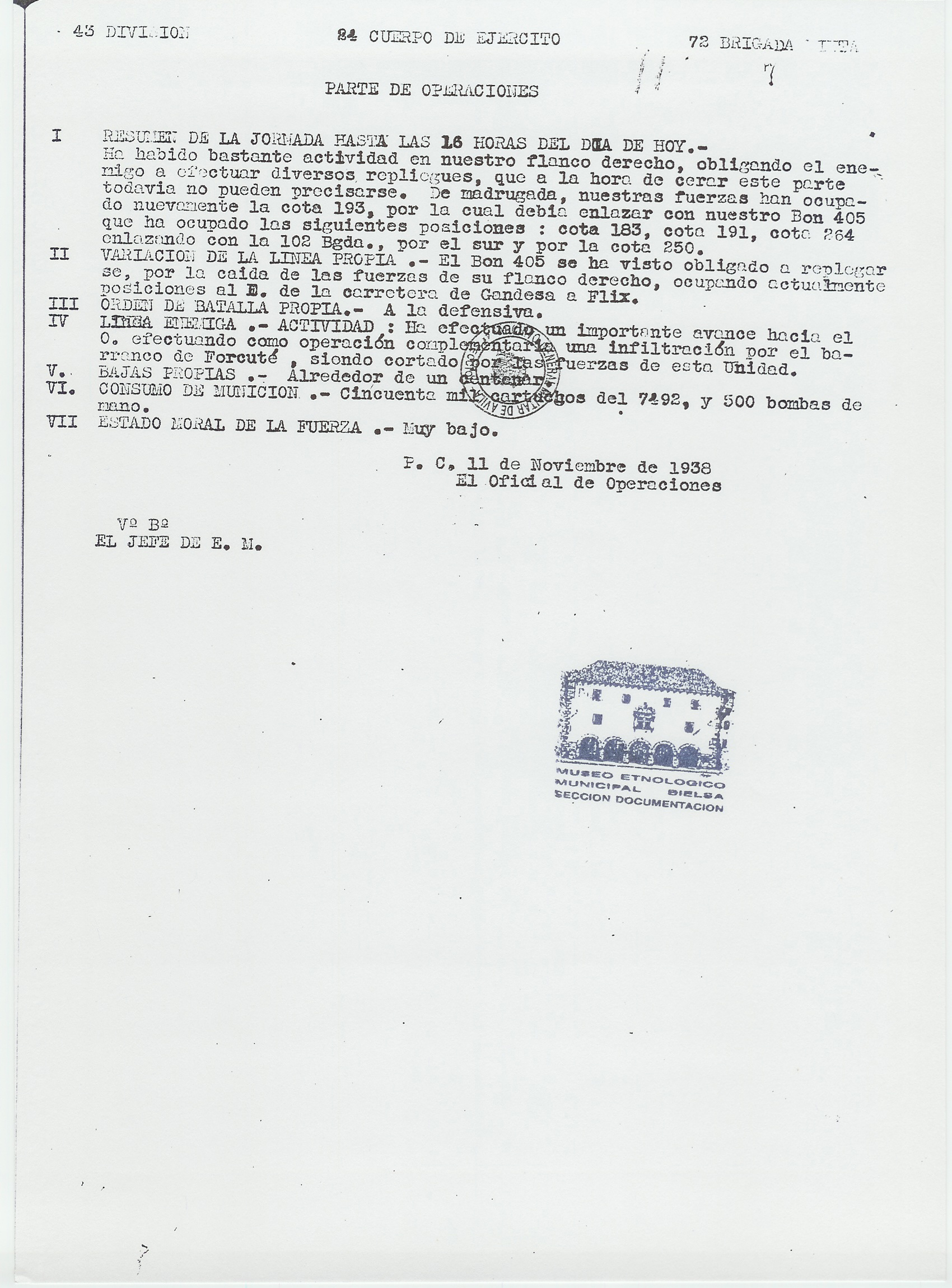 | Contenido: Ocupación de la cota 193, con repliegue, por parte del 405º Batallón, hacia la carretera de Gandesa a Flix, lo que supone el hundimiento del frente sur. Se cuenta con más de un centenar de bajas propias. |