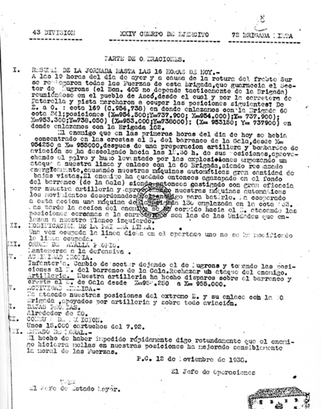 | Contenido: Repliegue general de la brigada a nuevas posiciones debido al hundimiento del frente sur, concentrándose en la localidad de Ascó. Se reseña el ataque enemigo por el barranco de la Gala, con enérgica resistencia de la unidad, apoyada por artillería y elementos de la Brigada 130ª. |