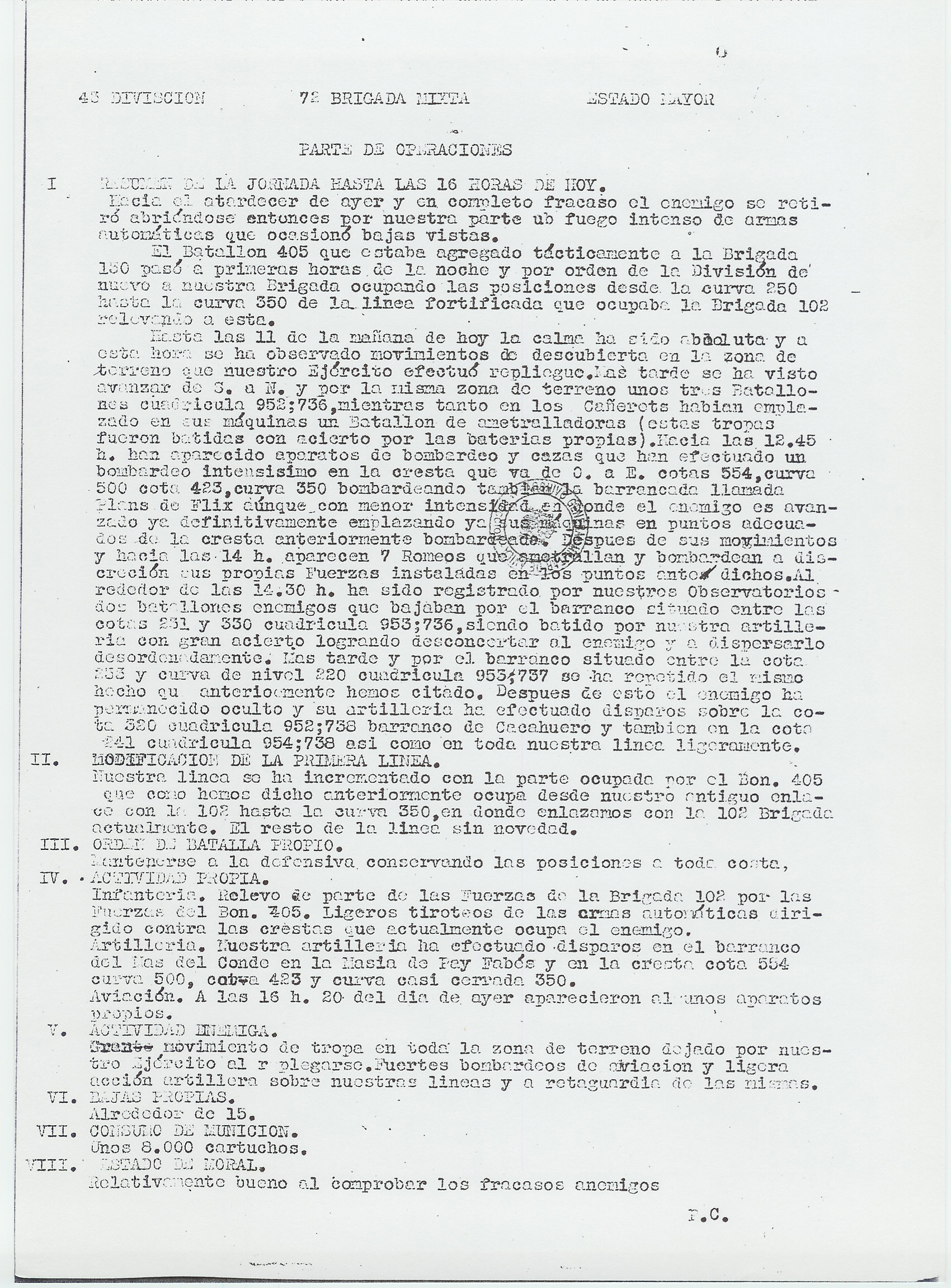 | Contenido: Se señala la relativa calma del frente, con hostigamiento de artillería a los movimientos de descubierta enemigos en la zona de Flix. Incorporación a la brigada del Batallón 405º. Acciones de la artiillería y aviación enemigas, con un cálculo de 15 bajas. |