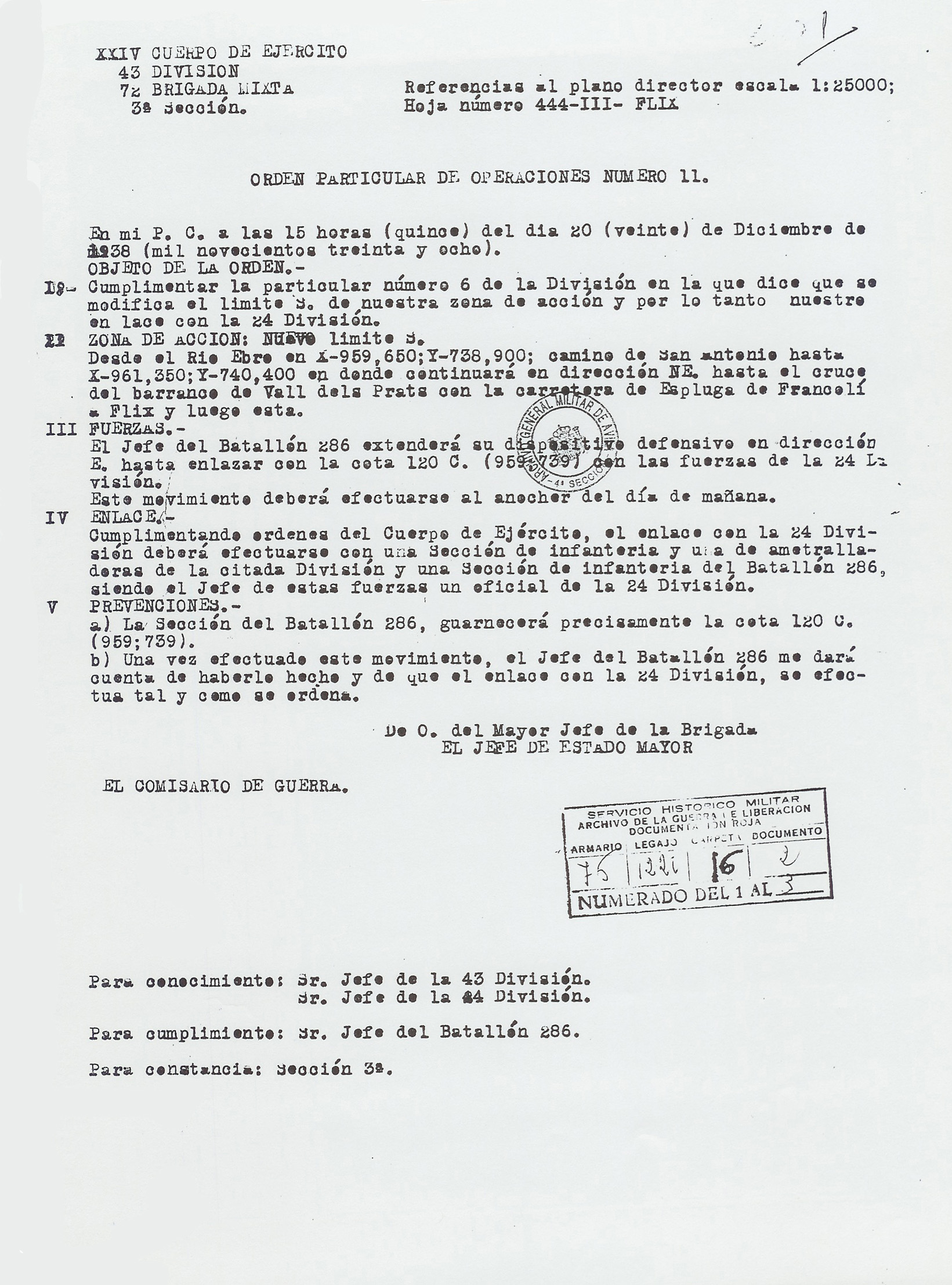 | Contenido: Orden particular de operaciones número 11. Se destaca la necesidad de cumplir los objetivos de la orden divisional número 6 en la que se modificaba la asignación de posiciones de la unidad, en la zona del barranco de Valls dels Prats con la carretera de Espluga de Francolí a Flix. El batallón 286º se desplazará por la noche a nuevas posiciones, enlazando con elementos de la 24ª División. |