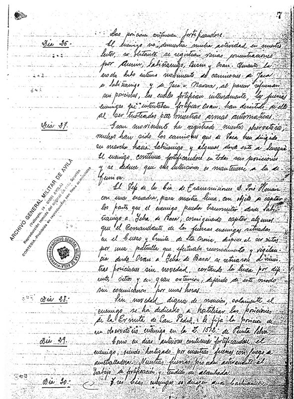 | Contenido: Diario de operaciones del estado mayor de la 72ª Brigada Mixta. Se observa movimiento de camiones de las tropas franquistas en la zona de Jaca a Navasa. El jefe de la compañía de transmisiones José Herraiz ha salido con una escuadra para interceptar partes enemigos de la zona de Sabiñánigo a Yebra de Basa. |