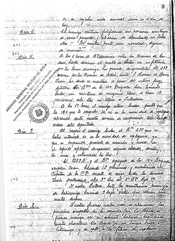 | Contenido: Diario de operaciones del estado mayor de la 72ª Brigada Mixta. Se producen enfrentamientos que concluyen con la toma de Sardas y Osán, aunque la primera será reocupada por el ejército franquista. Se hacen prisioneros y se recoge documentación de las tropas franquistas. El día 8 de octubre se ordena abandonar las posiciones ocupadas anteriormente. Se divisa en las inmediaciones de Sabiñánigo un tanque oruga. |